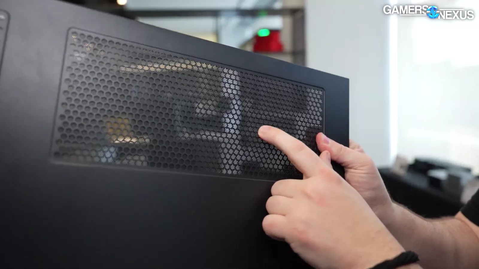 On the back of the case, it has large ventilated holes both vertically and horizontally. Taking the back panel off, one thing we’d like to see is refinement on the magnetic filters. Currently, they’re not done yet but you can see a lot of metal ending up in the hexagon-shaped cut-outs. If they could punch out larger holes or use a finer mesh and get rid of the dust filter or something like that, that would help a lot with thermal performance and letting air through.