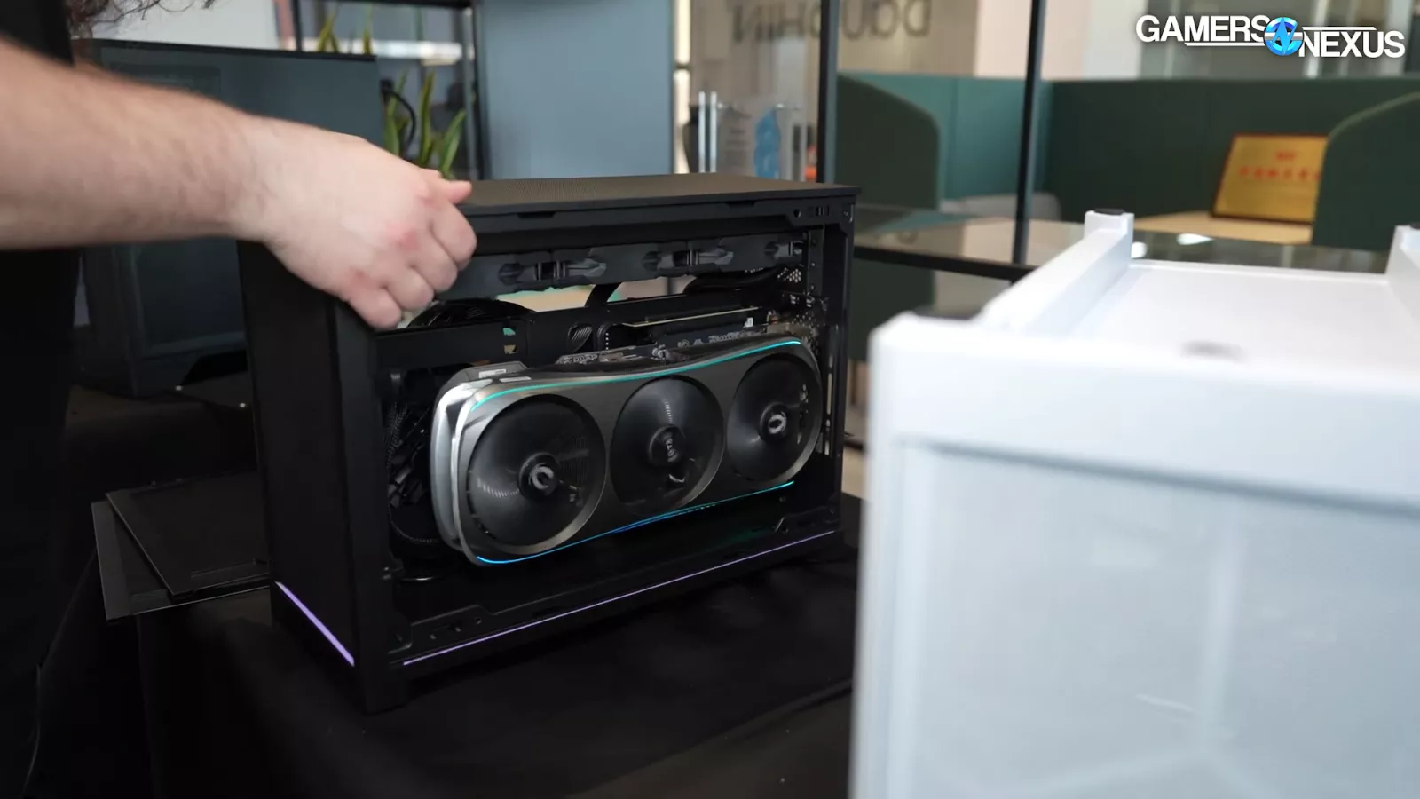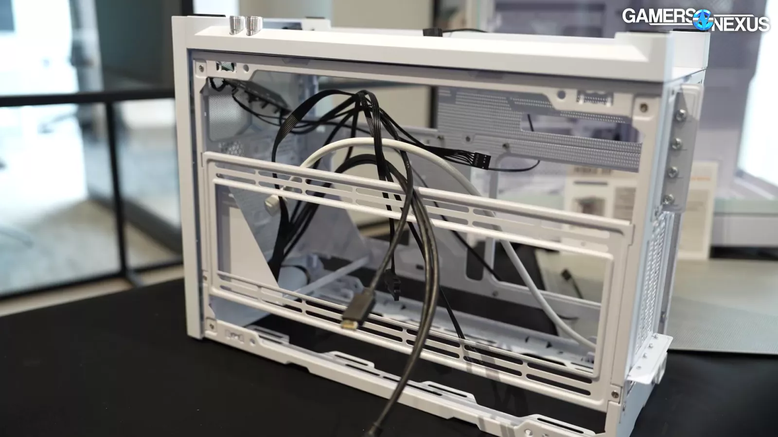 The case has excellent side panels. They are basically giant pieces of mesh and also provide air access to the GPU, which is great. Using a glass-side panel in front of the GPU would really suffocate the card. The challenge with the case’s design is that flow-through video cards will dump heat to the power supply fan, which is fine as the PSU can take it. The question becomes where does the air go after that?