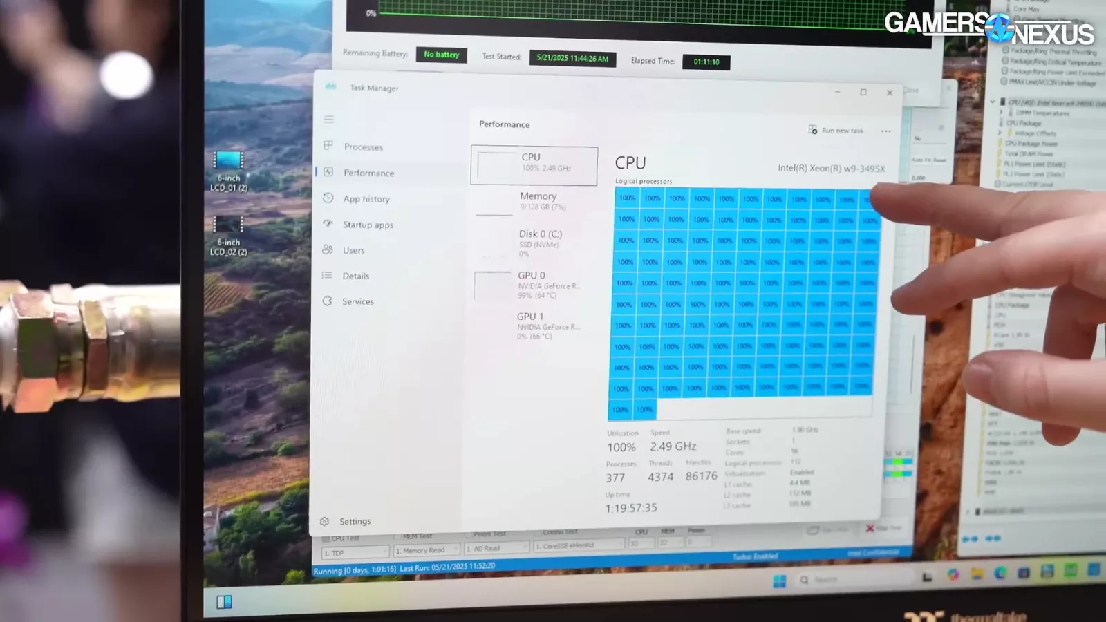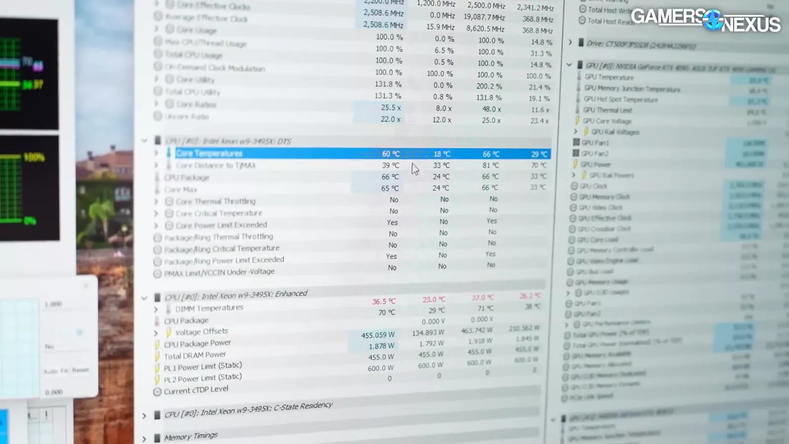 The PC had its CPU, an Intel Xeon w9-3495X, and GPU both at 100% load. CPU core temperature clocked in at about 60 degrees C and the GPU was about 64 degrees C. We estimate that the room the computer was in felt about 23 degrees C.