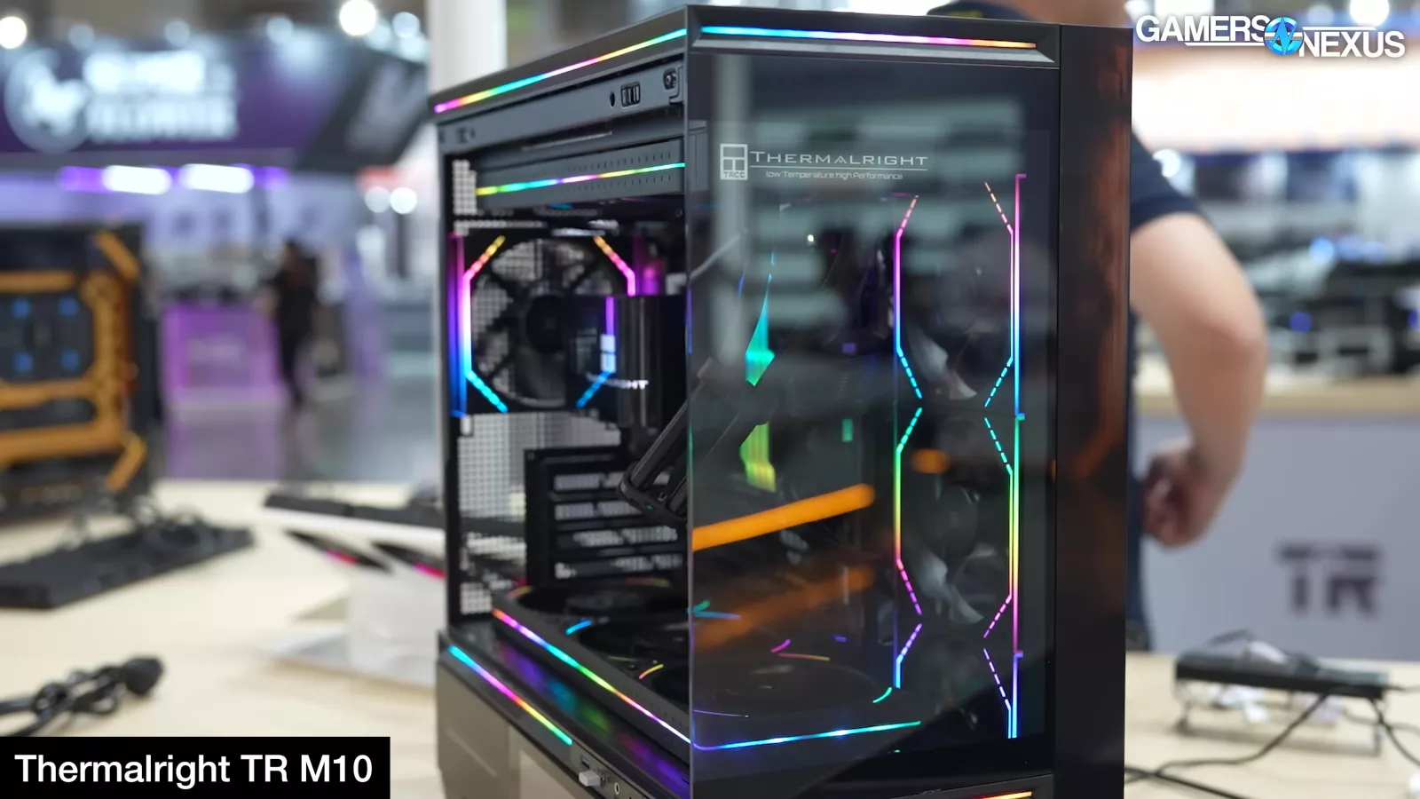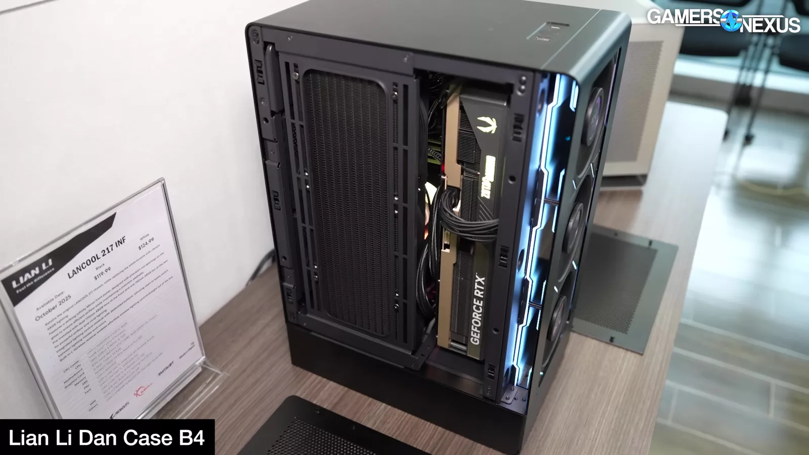 Lian Li had a few honorable mentions at the show: Its O11 Mini V2 made an appearance and manages to cram an ATX power supply into the case by punching out space in the side panel. The Mini V2 should be $90 without fans and $100 with 5x 120 fans. The Dan Case B4 was also an interesting showing, mostly for its ability to attach feet and switch to a much higher volume vertical orientation. It makes use of the space provided by the feet by also including a radiator extension chamber to support a 360mm radiator on the side. More interestingly to us, the Vector 100 and Vector 100 Mini cases are extremely cheap. The Vector 100 Mini micro-ATX case is intended to sell for $45 without fans, making it a direct competitor to Thermalright’s new mATX case.