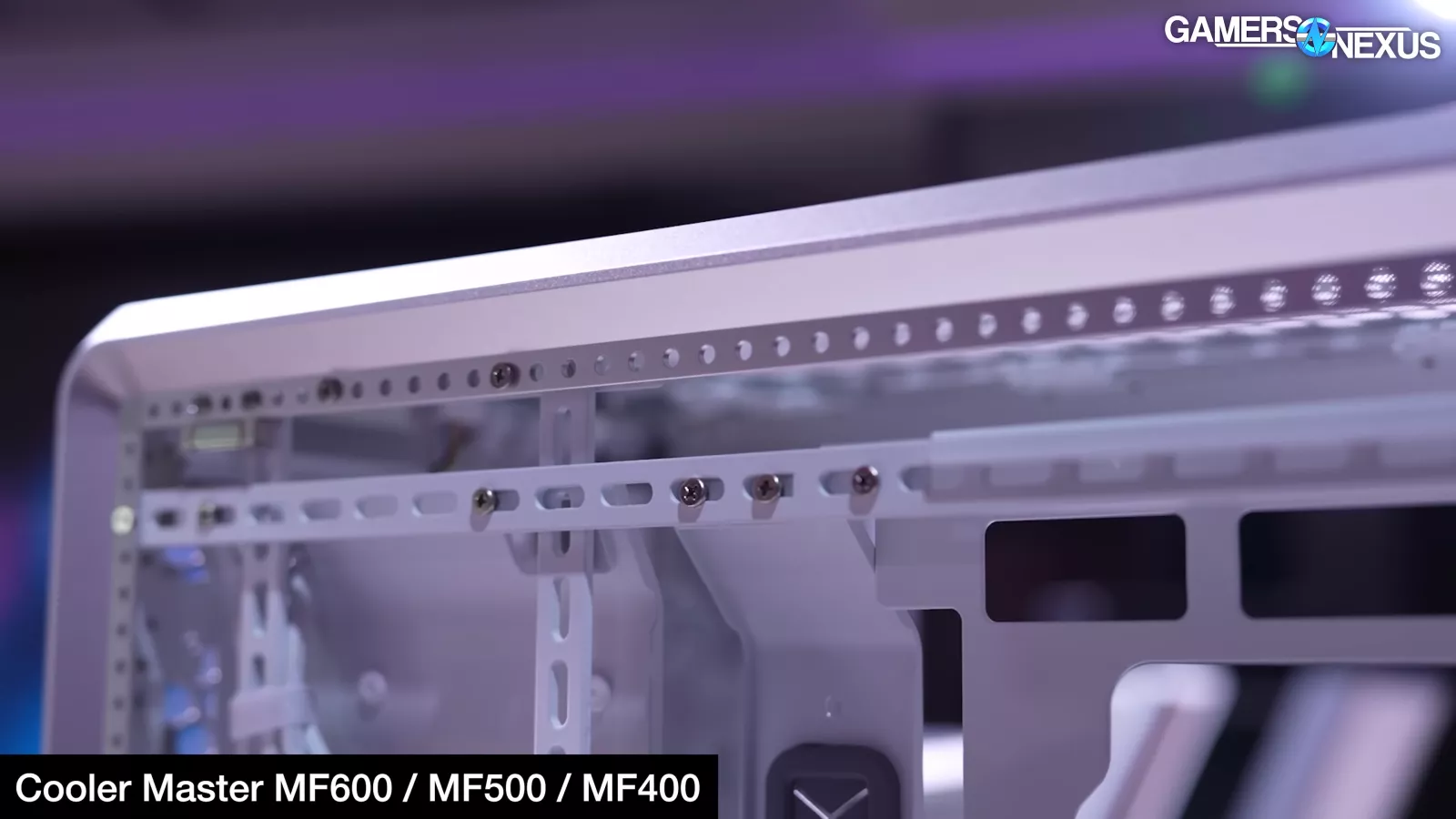 The MF600 is the largest of these, with 3x 140 fans and 1x 120 fan included. Price target is $200, tariffs notwithstanding. The MF600 has an all aluminum look to it, though uses a mix of materials for the chassis. Externally, Cooler Master has done well to blend the columns, corners, and panels to create something that has a less-gamer aesthetic to it. The front-to-back flow design is classic and should work well. Internally, the motherboard tray is basically a giant hole with some rails and slats across for support. This means a weaker tray structurally, but one which is more versatile (as shown in the reconfiguration with different orientations).