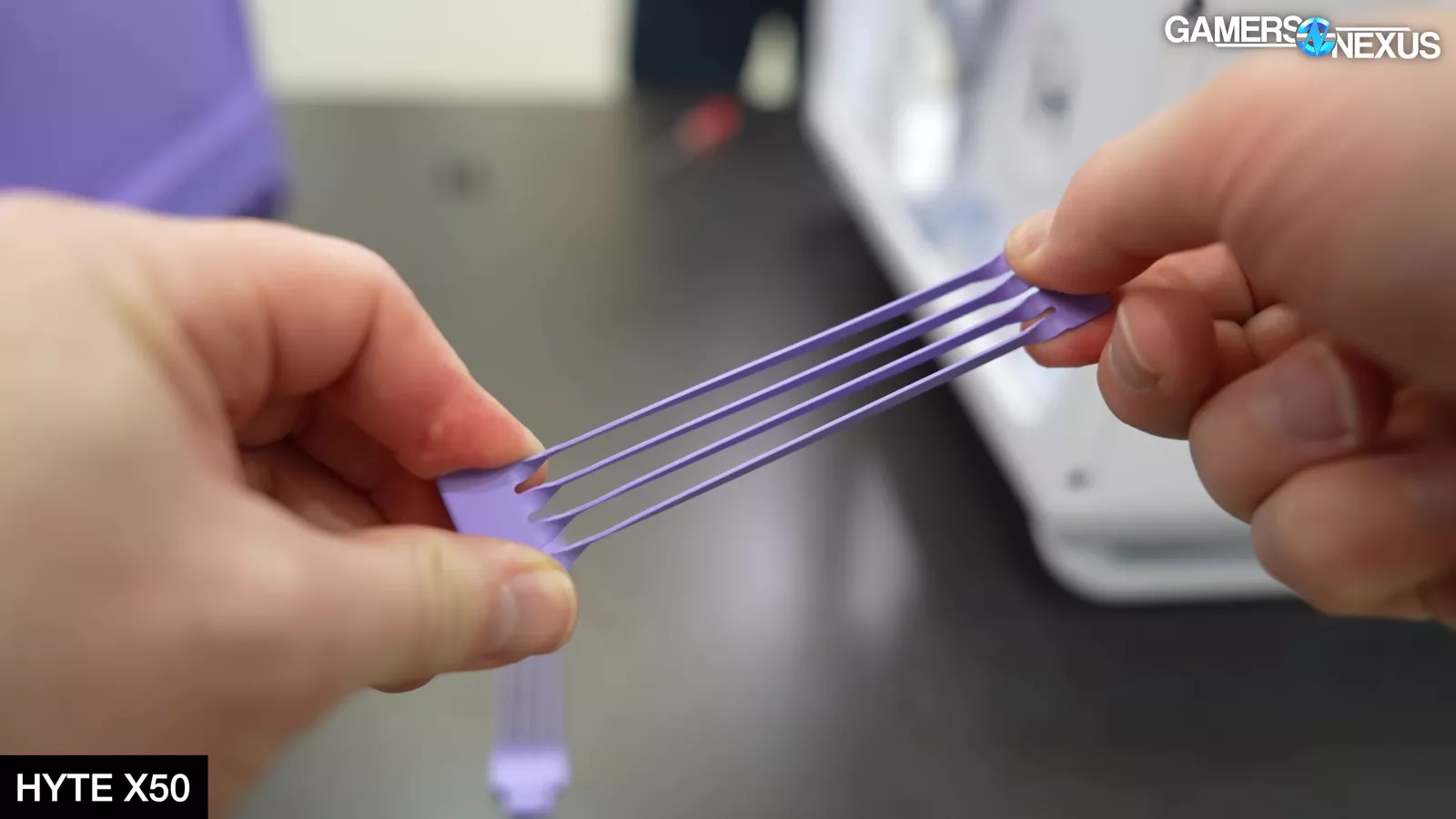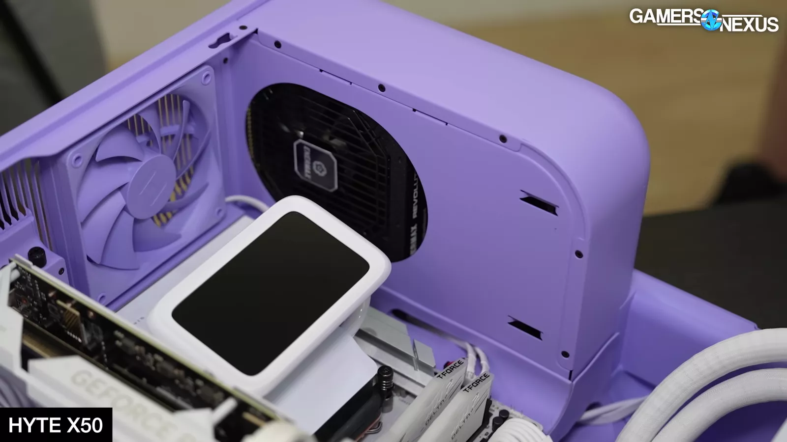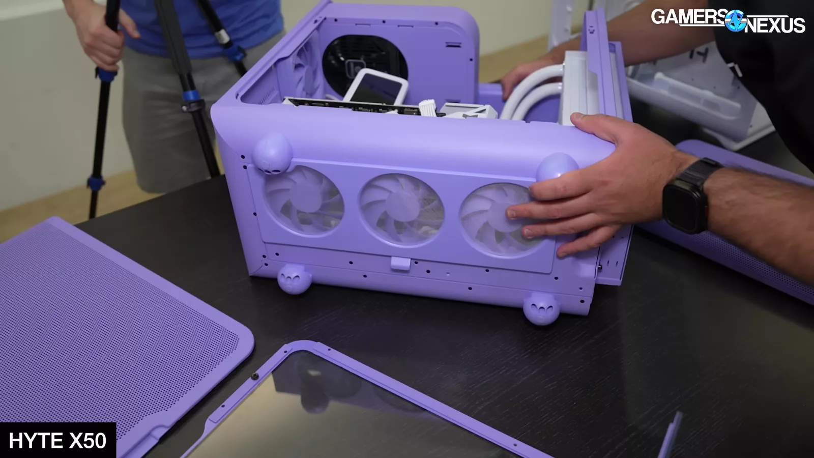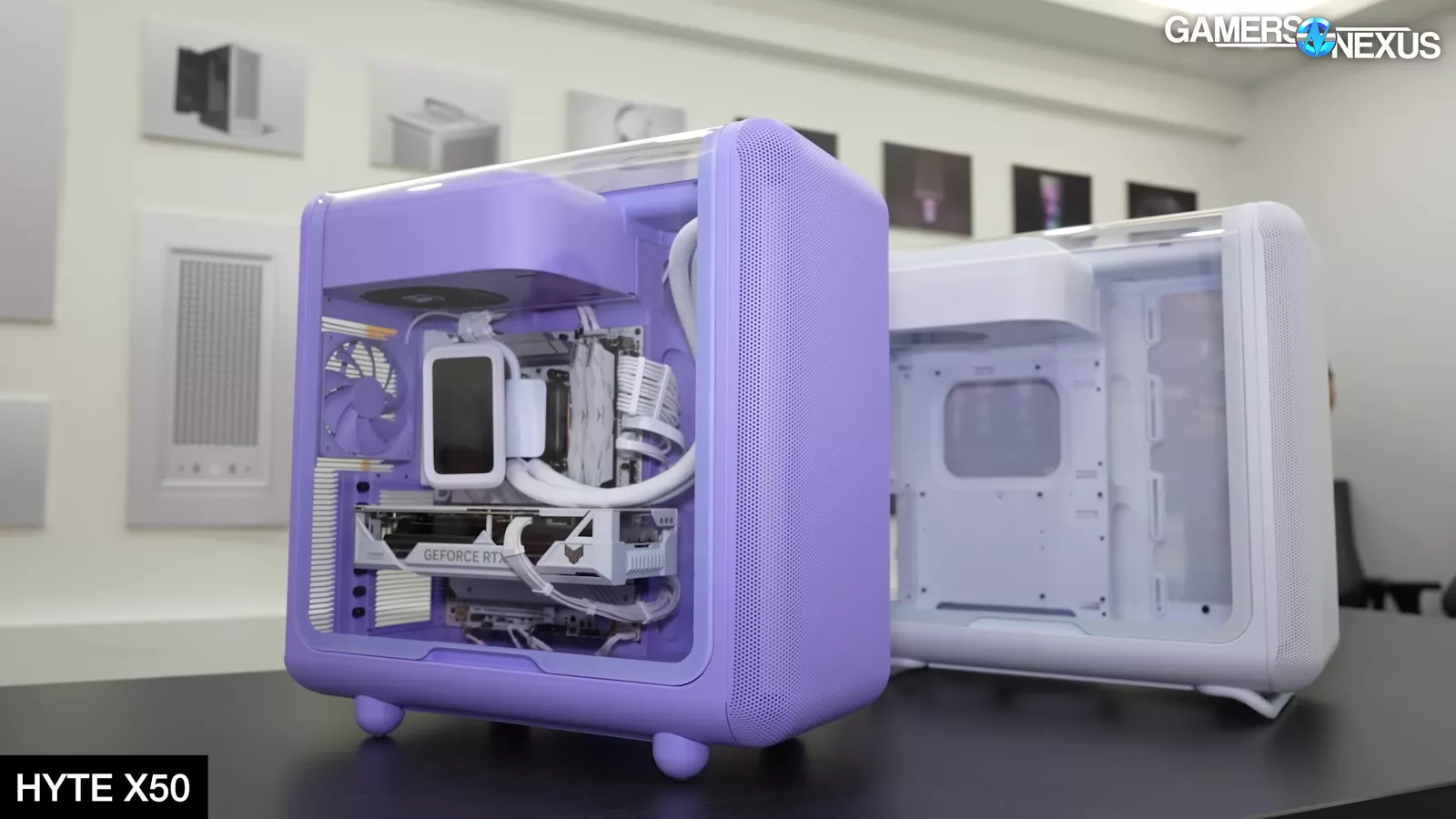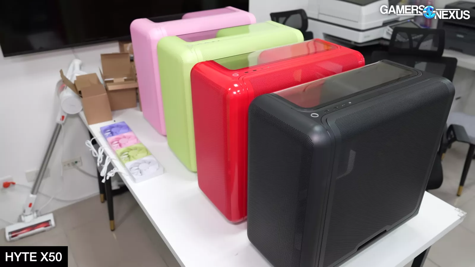Hyte showcased its new X50 case, which is its most mechanically complicated product to manufacture to-date. The X50 uses a bubbly external look while attempting to be the highest-performing case on benchmark charts. Hyte uses a front panel that’s perforated all the way around the apex of the turn, leaving only a small strip at the mounting point for rigidity. The case also has louvered slats at the back, including for the PCIe slots, which add mechanical and manufacturing complexity but strengthen the chassis structure while improving airflow performance. Hyte noted that its intent, which we’ll test in our review, is to help project air away from the system, highlighting that there’s always focus on reducing intake impedance but noting that exhaust impedance is similarly important.
