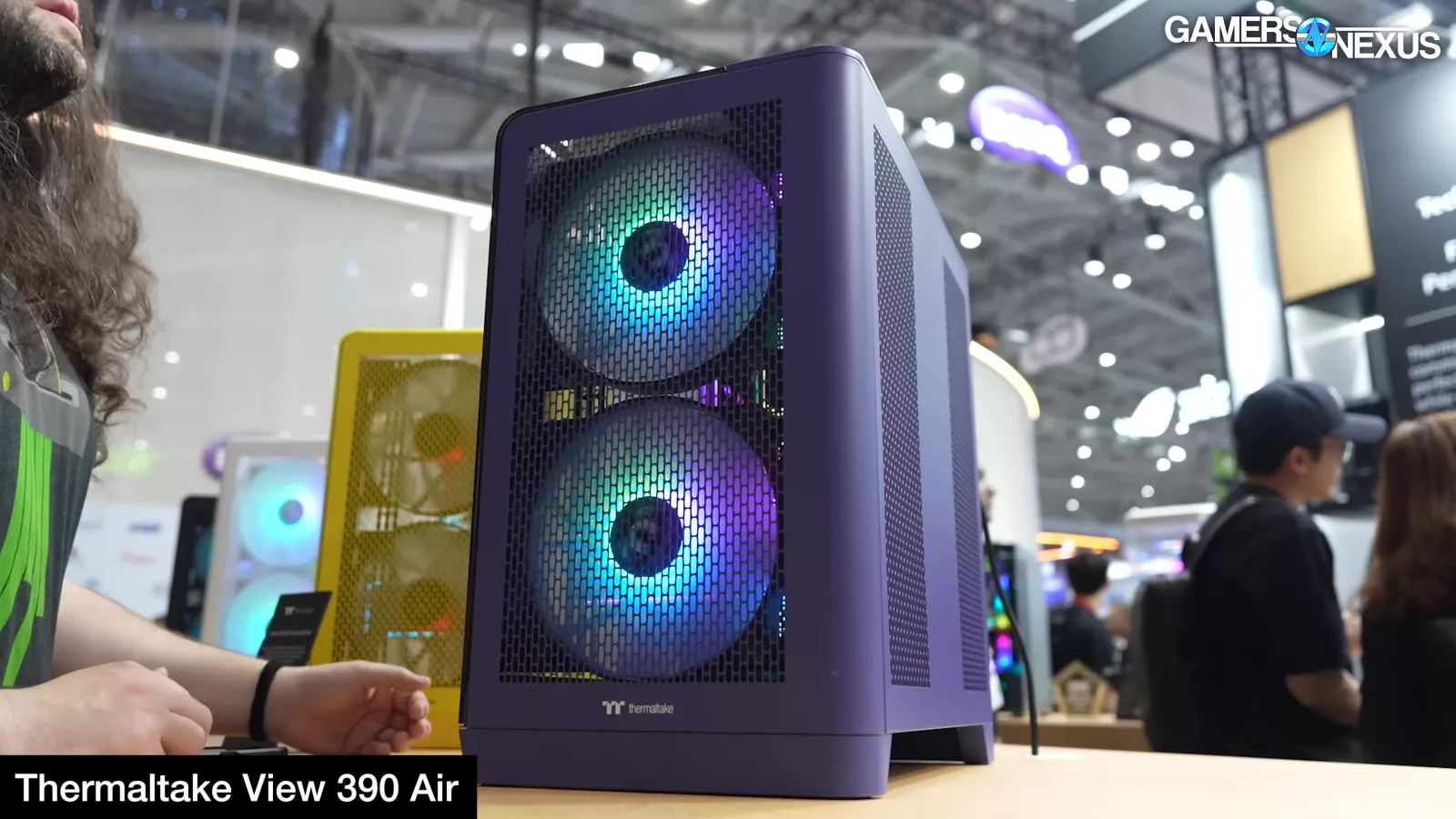 The View 390 Air uses a curved tempered glass panel around the top and side, with options for up to 200mm fans at the front. Thermaltake hasn’t yet finalized the stock fan configuration, but has finalized the price: It’s trying to hit $150 pre-tariff and the company thinks it can include 2 fans at that price. They mentioned to us options of either 2x 200s at the front or 2x 120s at the back or side. We’d favor the 2x 200s, mostly because users with liquid coolers will already be getting 120s, and 120s are also more common just in bins of parts from seasoned PC builders.