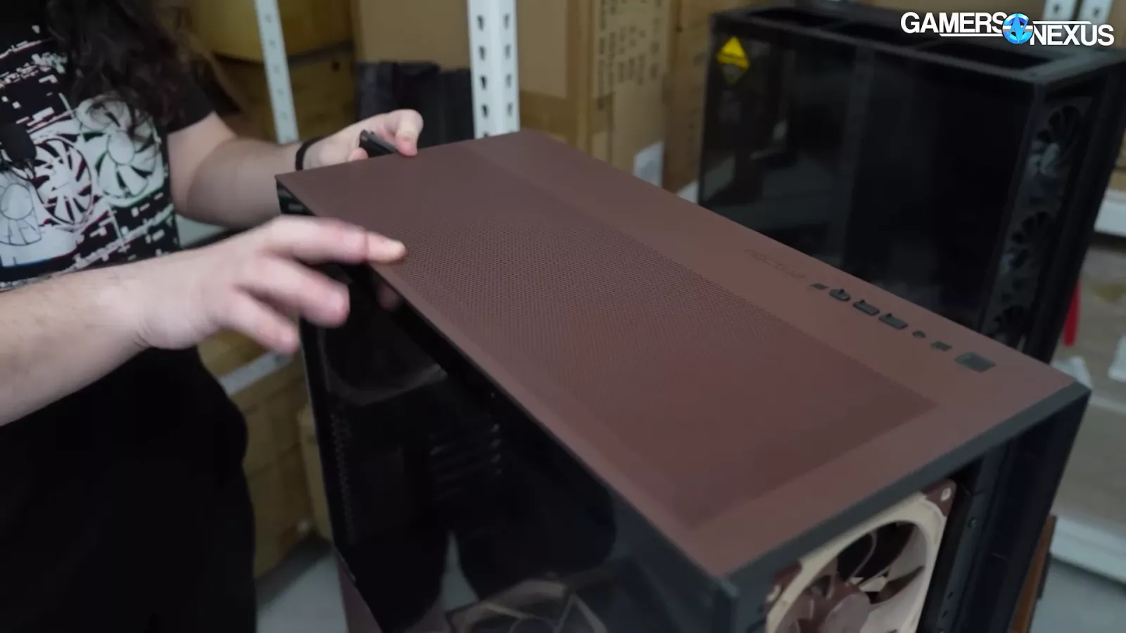 In terms of changes Antec has made, besides changing the fans, they’ve added the word Noctua to it. The panel covering is also different. Antec tells us that the steel brown paneling on the case was difficult to match with Noctua’s brown hue. In general, we’ve heard that color matching for manufacturing is apparently very hard. Pretty much every factory we’ve been to has told us this. Antec told us it spent over a month trying to get the correct brown to make Noctua happy with how the color came out. It sounds like everyone is happy with the end result.