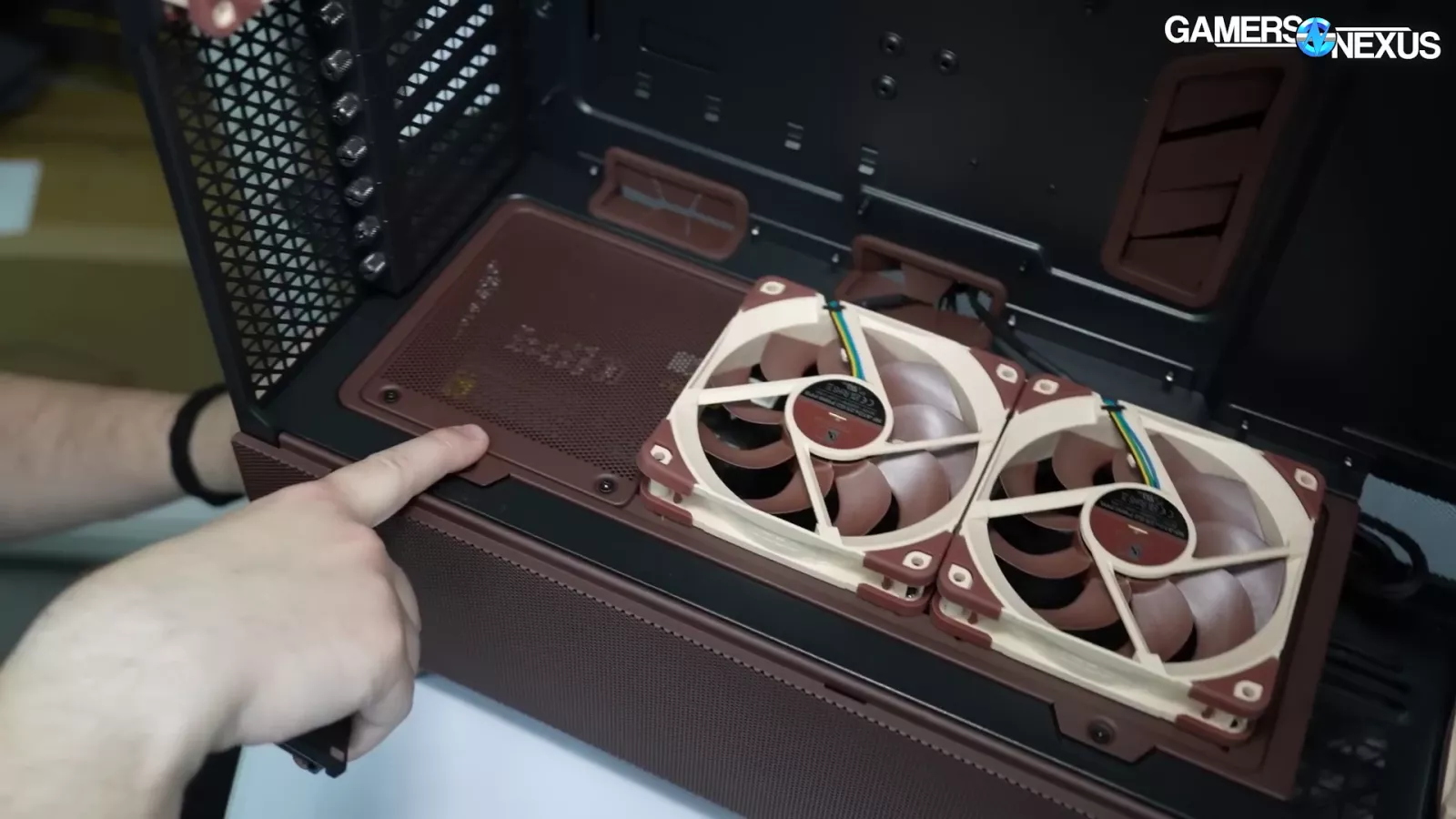 The case is the same size and layout as the original Flux Pro and has 2x120mm fans on the bottom (the original featured reverse blade fans on the bottom). The fans used here are the NF-A12 G2s, which are new fans. The rest of the case uses NF A14 G2 fans. This includes 3 of them in the front and 1 in the back. The G2 model we talked about in our NH-D15 G2 review has its fans slightly offset the RPM intentionally to try and avoid beat-frequency phenomenon and such that will create an undesirable noise.