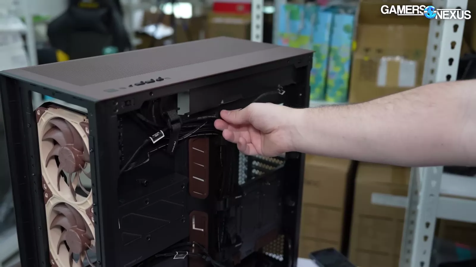 Looking at the back side panel of the case, the unit we saw had extension cables for its fans, which Noctua may also use, but that’s not certain at the moment given the build we saw is early. They’re pretty nice and we use them in our test benches.