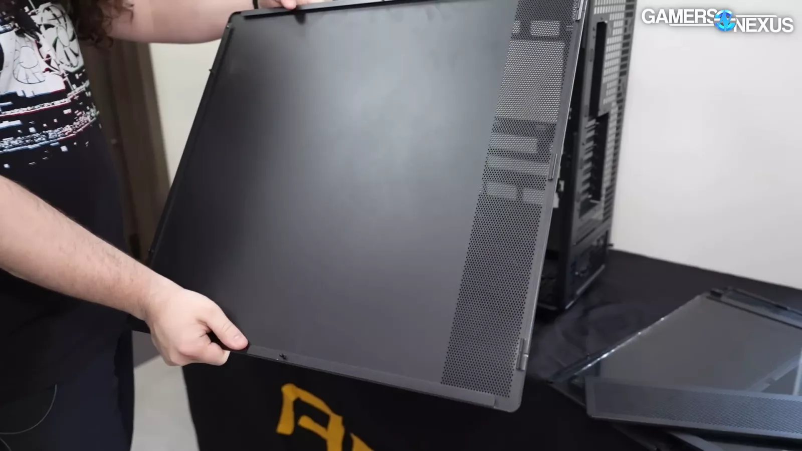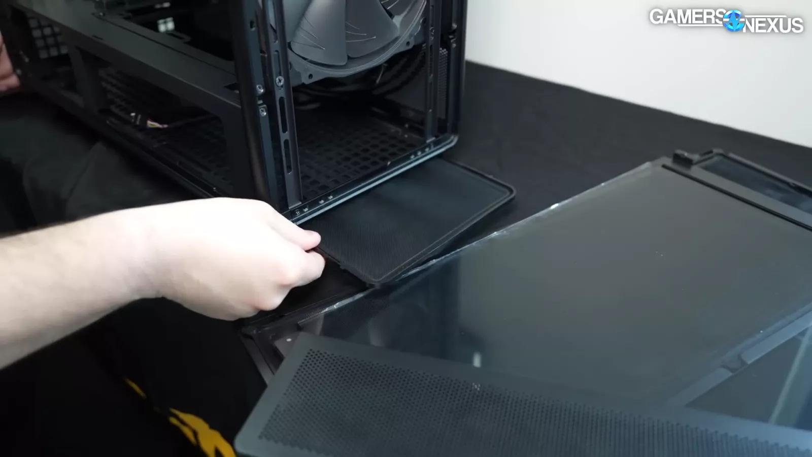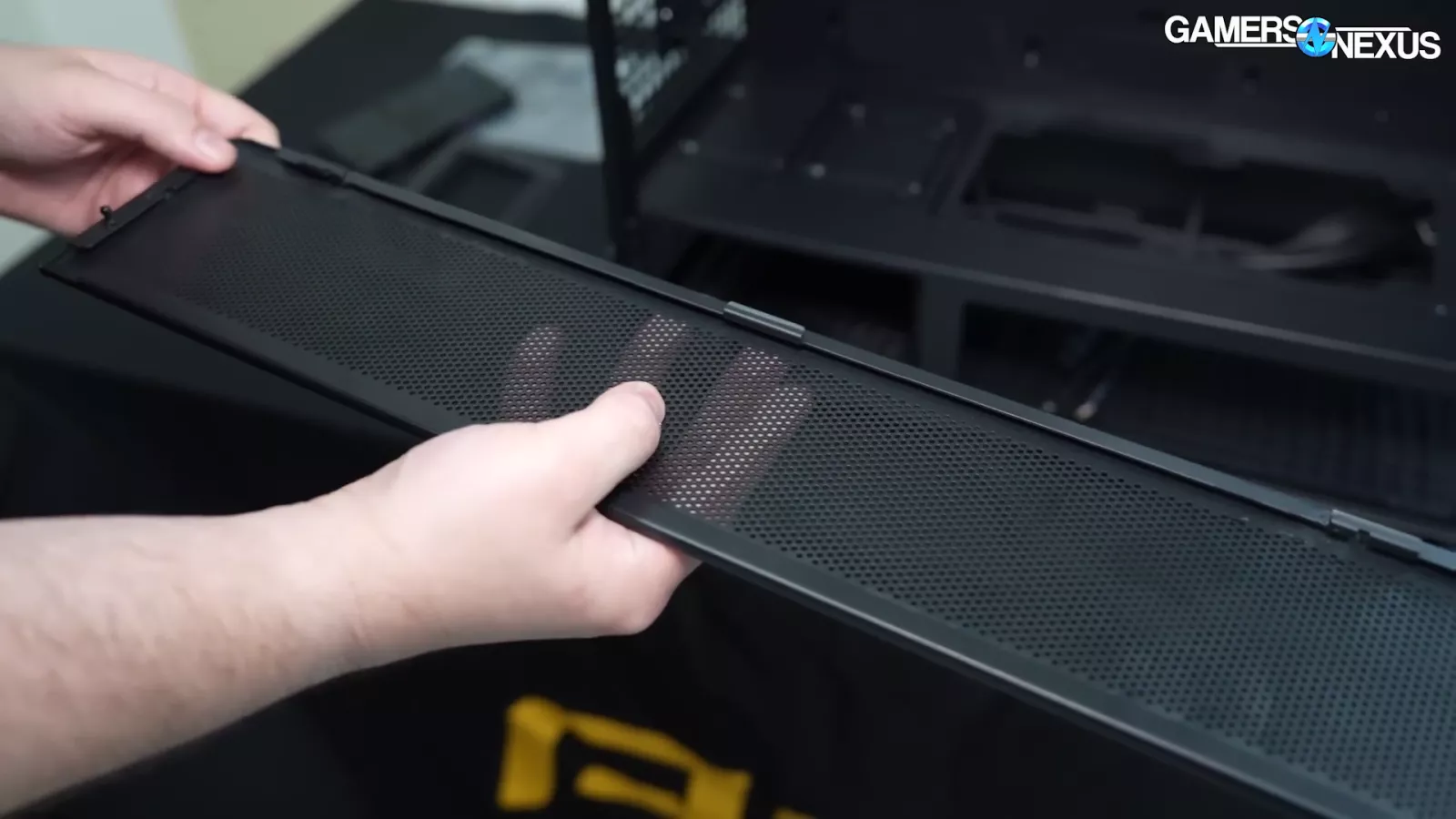 Looking at the top panel, it uses massive holes in its design coupled with a dust filter. In some ways, this is traditional. The upside is that the actual panel itself isn’t doing a whole lot other than just providing the structure, which means it’s not really getting in the way of airflow because of how huge the holes are. It’s really going to come down to the dust filter for how much air can get through. If you’re going to use the top panel for exhaust, we would recommend pulling the dust filter off because it’s not stopping a whole lot of dust.