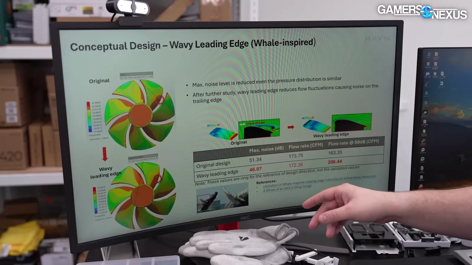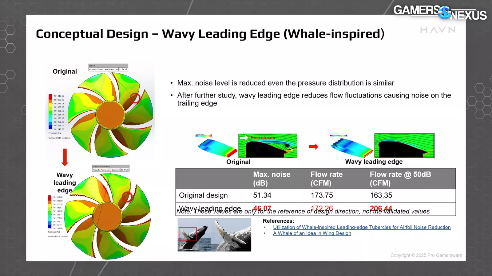 The image above is really cool. Referencing whale-fin evolution, HAVN used tooth-like leading edges on the fan to improve its thermal performance. We've seen this plenty of times in the past, but it never seems to stick around and we're not sure why. In this simulation though, HAVN suggests that the air stream is more uniform along the wavy blade design.