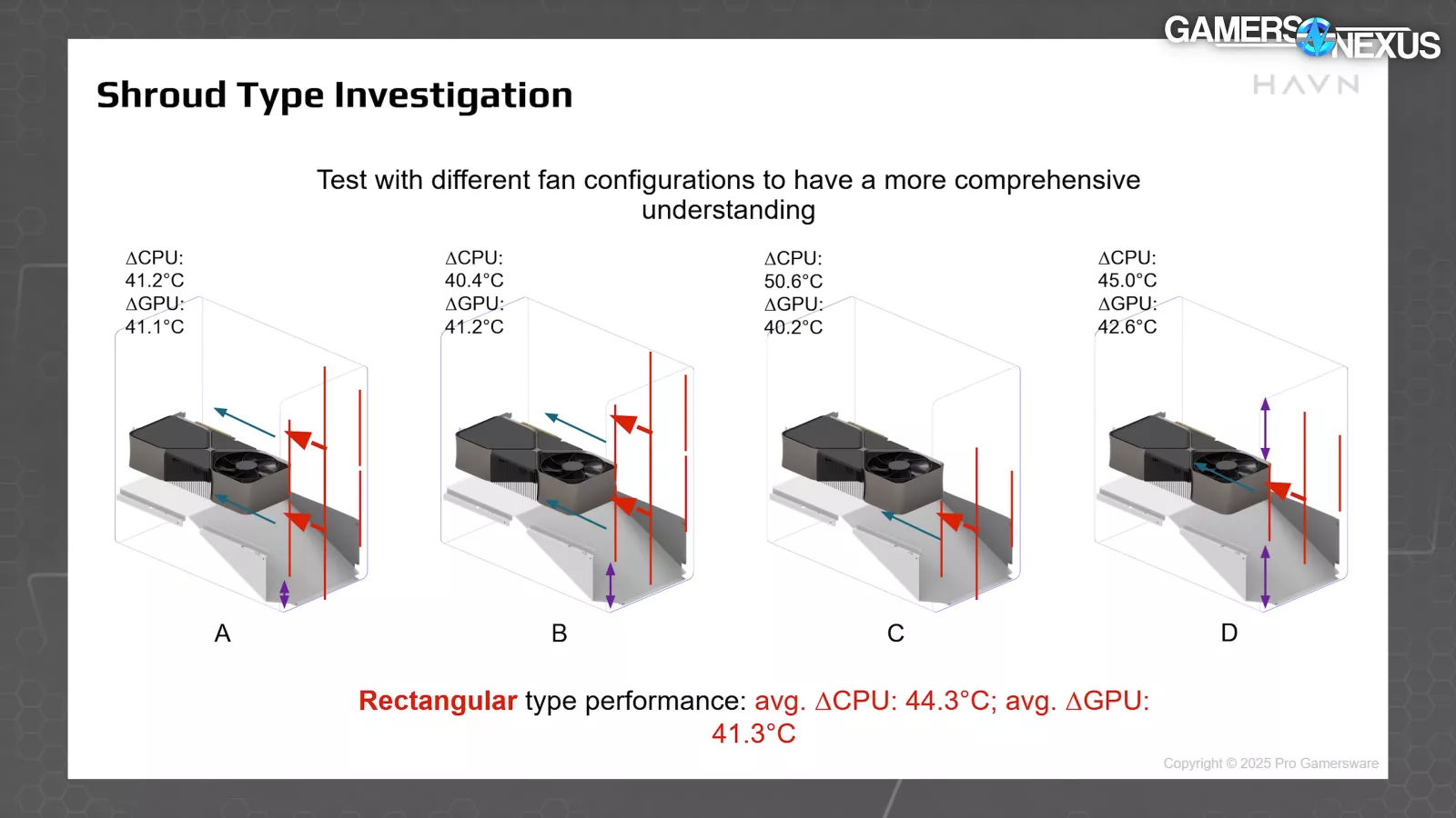 Thermal comparisons should only be made against their own results here, not against ours, as the benches are different. The flat, typical shroud style was comparable to the rectangular type in result, with the rectangular type slightly better. We think this will see a larger impact in our testing, but we'd need the three types to know for sure. The important comparison is against the cylindrical type, where HAVN saw worse results by a measurable amount. Performance worsened by 1-2 degrees on the CPU and about 2 degrees on the GPU. That's a large GPU temperature increase.