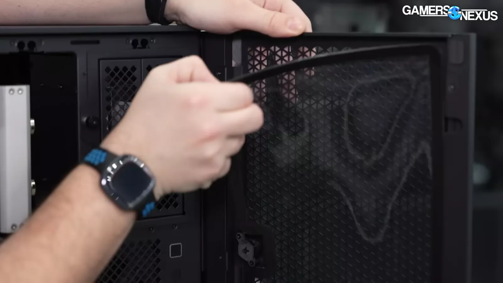 The case is topped off with a large aluminum panel that has a dust filter on it.
