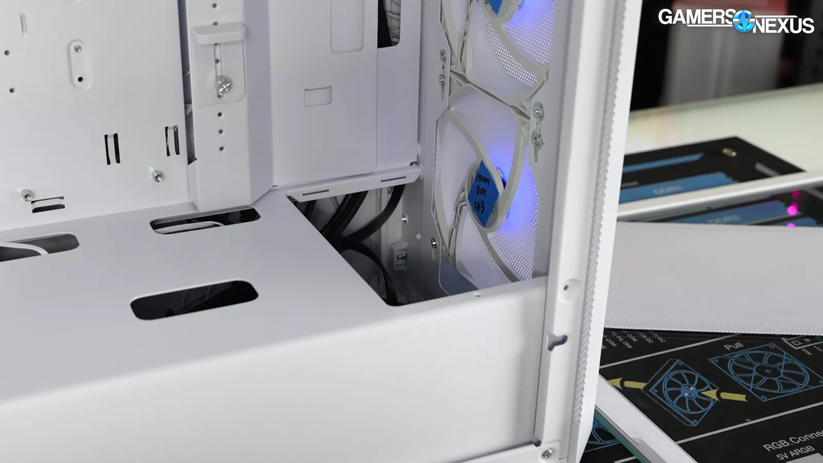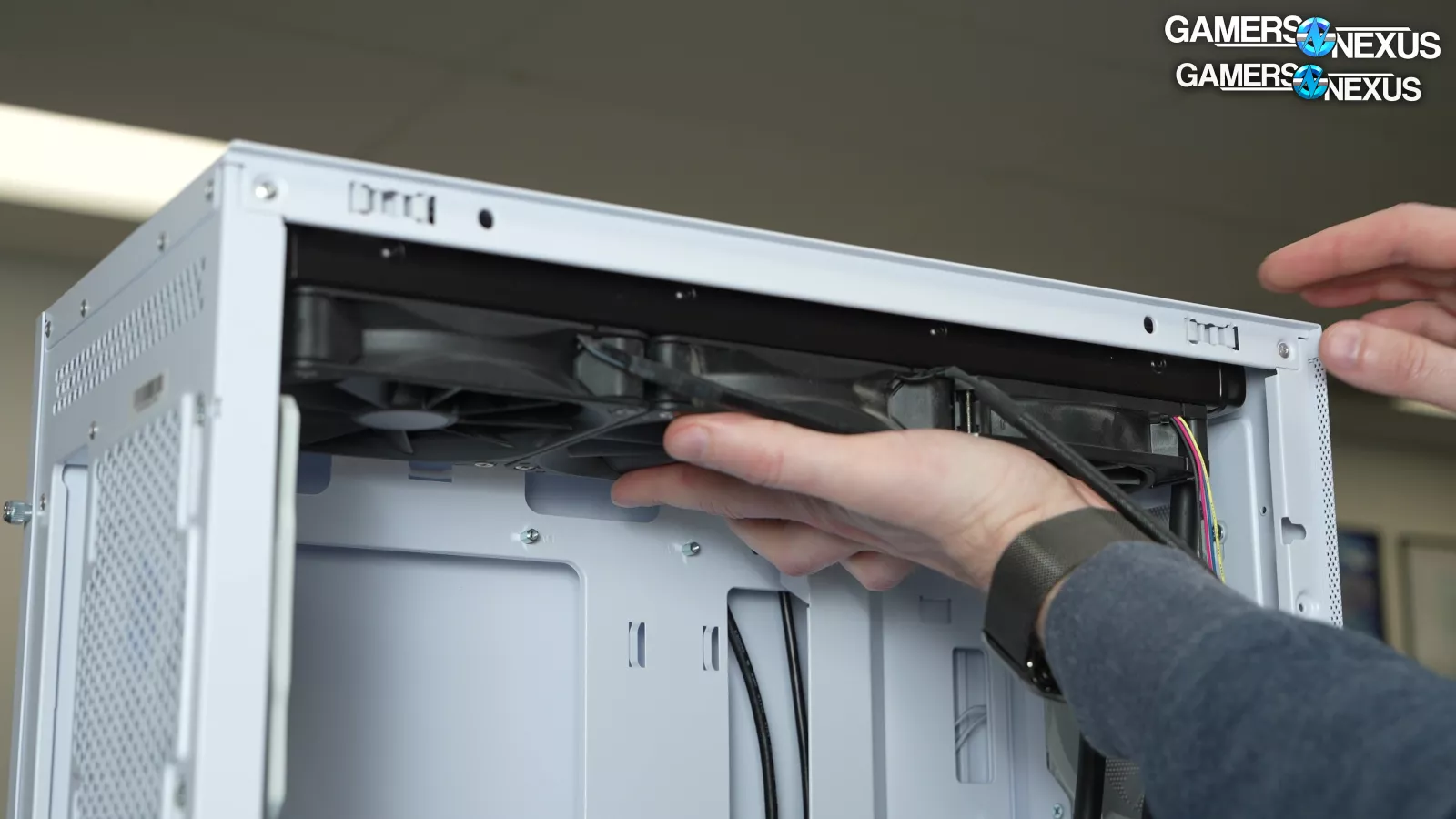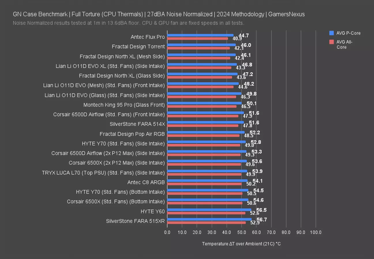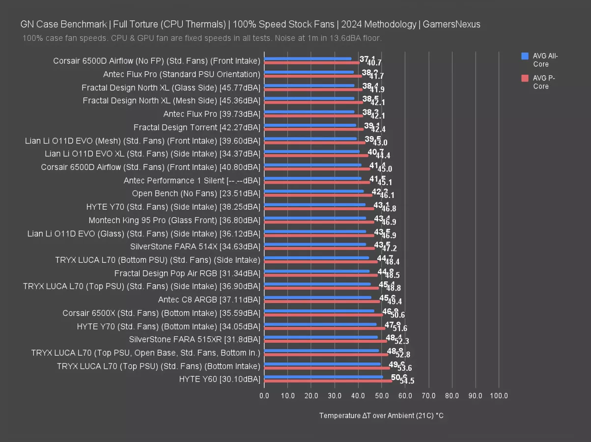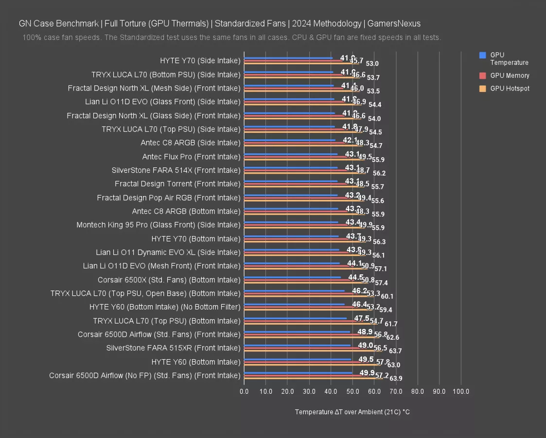 Our standardized fan test replaces all stock fans in each case with the same set of three Noctua fans: two 140mm intake, one 120mm exhaust. We have explained why there are limitations to this testing, such as worsening performance of cases which include more or larger fans. However, we run this test due to popular demand from the audience. You can find our methodology and limitations of this testing linked here.