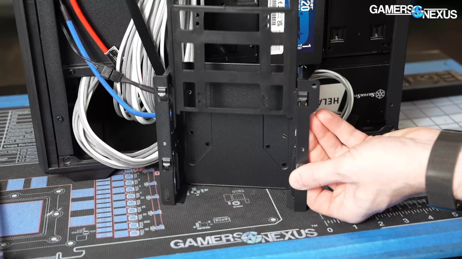 As for the lack of grommets, SilverStone advertises that a steel cover plate hides the cutouts and the cables routed through them. That's the theory, at least; we couldn't get the cover installed in its stock position. Fortunately there are two options for placing the cover (or it can be removed entirely, although the built-in GPU support relies on it. It's our policy to leave everything in place as much as possible for stock testing, but we were forced to shift the cover forward to get the 24-pin power cable connected. Moving the cover only requires removing one screw.
