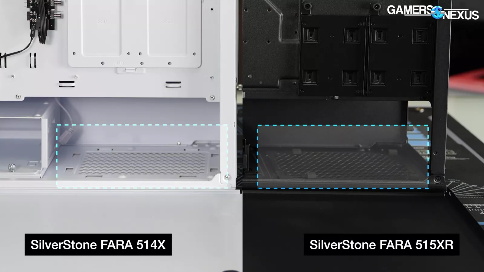 The 515XR has two internal 120mm fan mounts on top of the PSU shroud. We generally don't see much thermal improvement from shroud-top fans without careful planning, like in the Antec Flux Pro. The 515XR's shroud is mostly sealed. Still, it's an option that the 514X lacks.