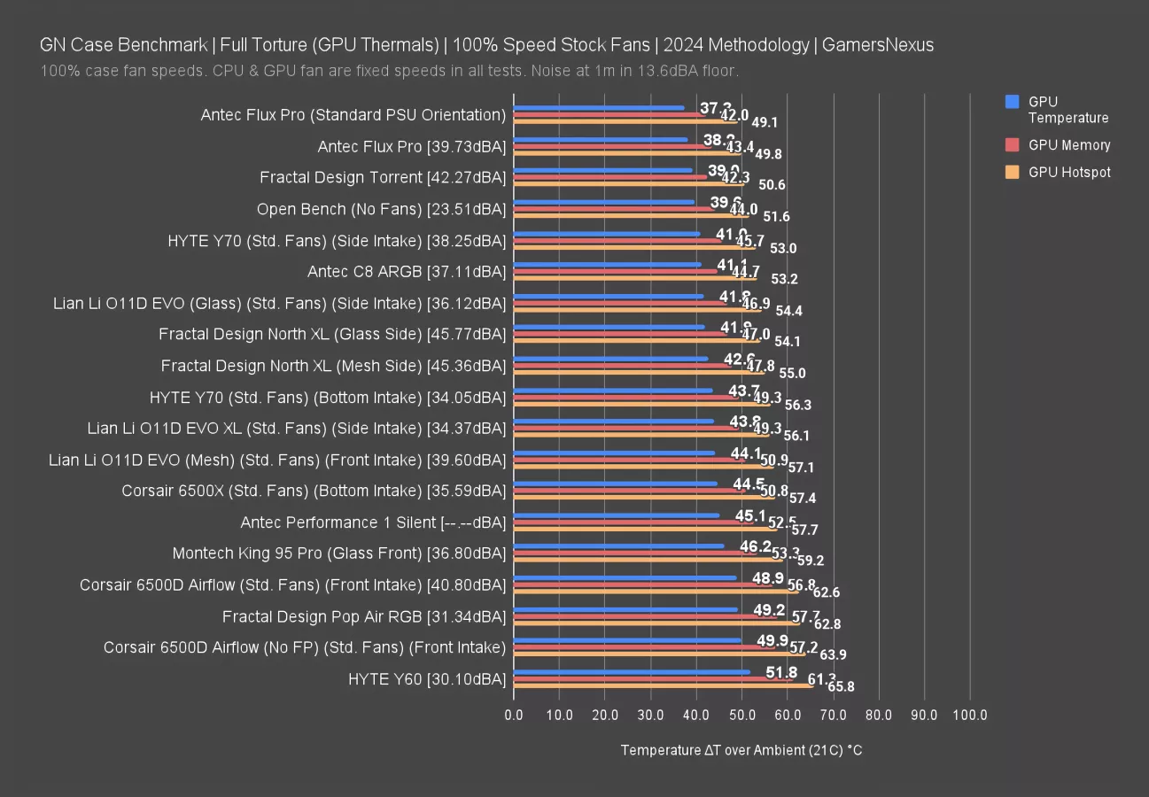The standardized fan test is most useful for case-to-case comparison when cases ship with insufficient stock cooling. That doesn't apply to the Flux Pro or the cases we're directly comparing it against, so we're not going to delve into comparisons here.