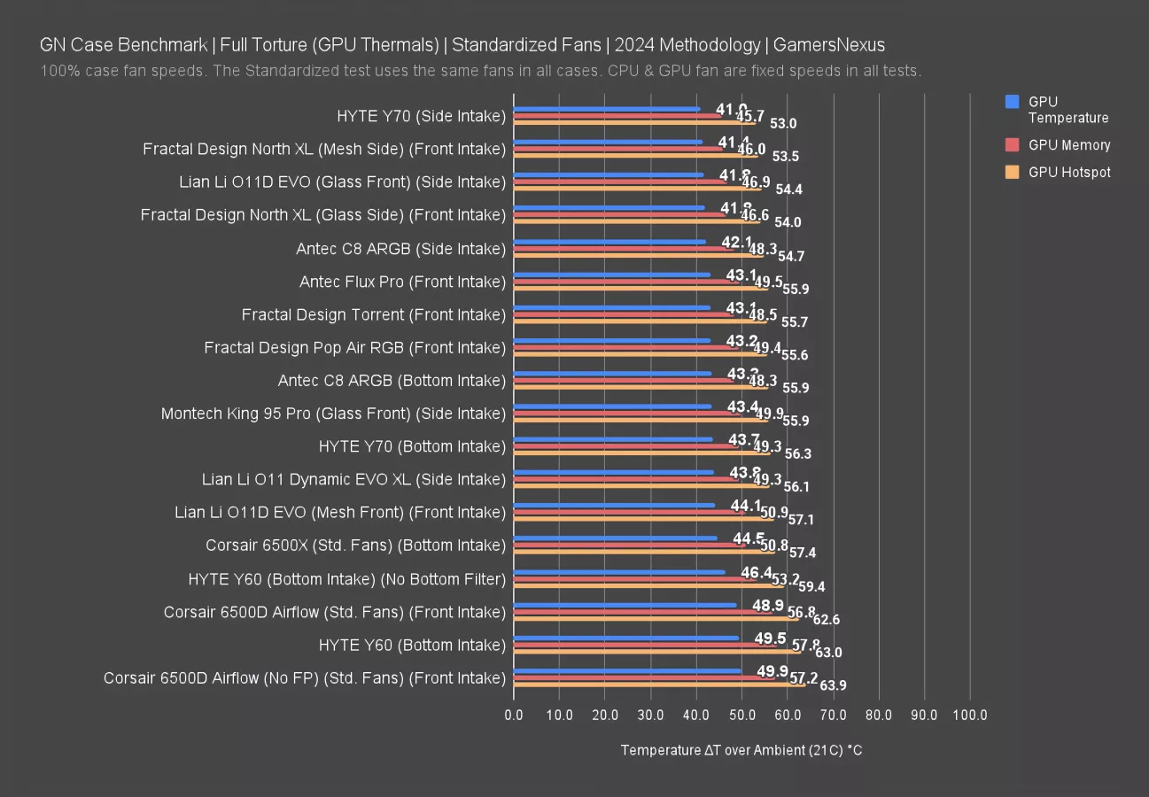 Compared to other cases, the most impressive thing here is that Antec has now chart-topped at 100% fan speed for GPU thermals in addition to its prior noise-normalized result for CPU thermals. At almost 40dBA, it is slightly quieter than the Torrent (at 42.3dBA) in our hemi-anechoic chamber while also running within error of it for thermals, or slightly cooler with the standard orientation. The Hyte Y70 is also somewhat competitive with side intake, mostly because it’s technically quieter than both of these options but still close in thermals. The Antec C8 also fits this, running quieter and slightly warmer. The Fractal North XL (read our review) is much less efficient in thermals for its noise tradeoff if you want to look at it that way.