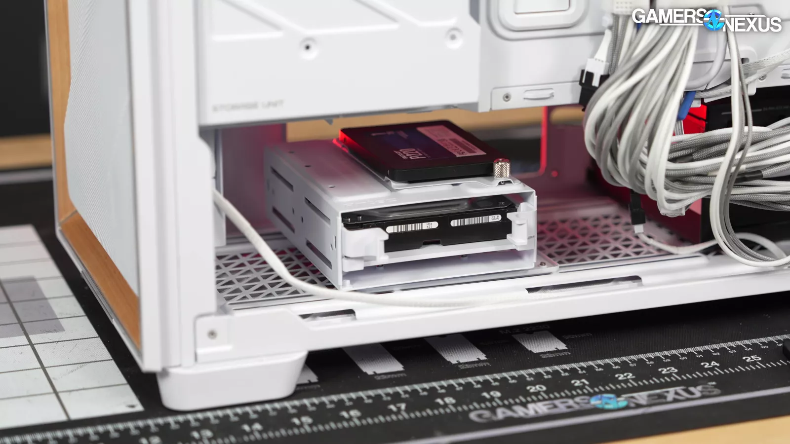 For drives: There are 2x 2.5" mounts behind the motherboard tray, 2x 2.5"/3.5" mounts towards the front of the case, and a cage under the shroud that can hold one more 2.5"/3.5" drive inside and another on top. The hardware is freely repositionable for this: We recommend just pulling the whole assembly out and relying on the other mounts if you don’t need that many drives, as it frees up several more fan slots, removes an airflow obstruction, and the remaining two 3.5" mounting locations have rubber vibration dampers.