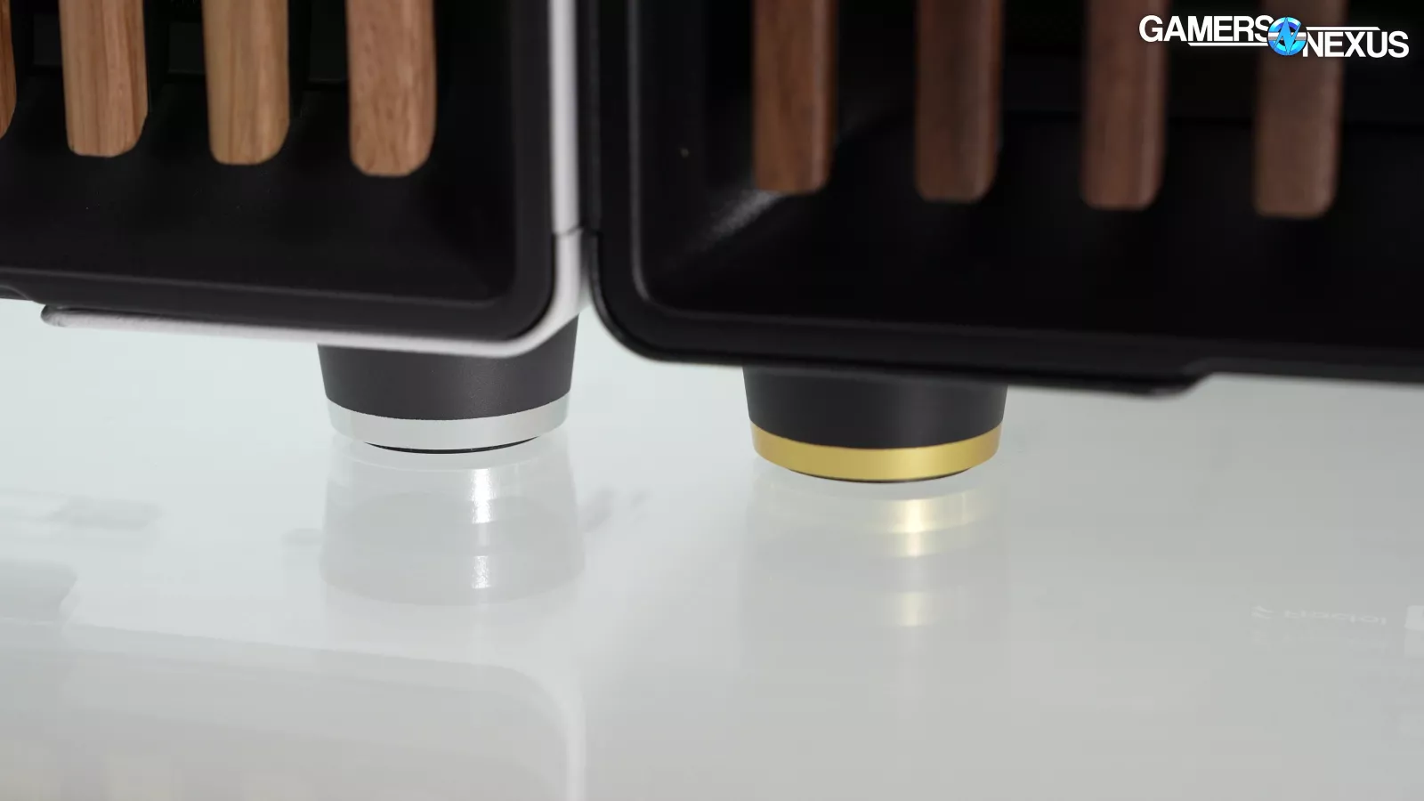 The North XL (read our review) is what we prefer to the North, mostly for its increased size for easier building and for our style of build, but both are good takes on the theme. Visually, the wood look doesn’t look like the slapped-on Vinyl style we see in other cases. It looks more purposeful. Fractal also does great work mixing different tone wood coloring with different panel coloring, including matching the black case with gold accents and the white case with silver accents.