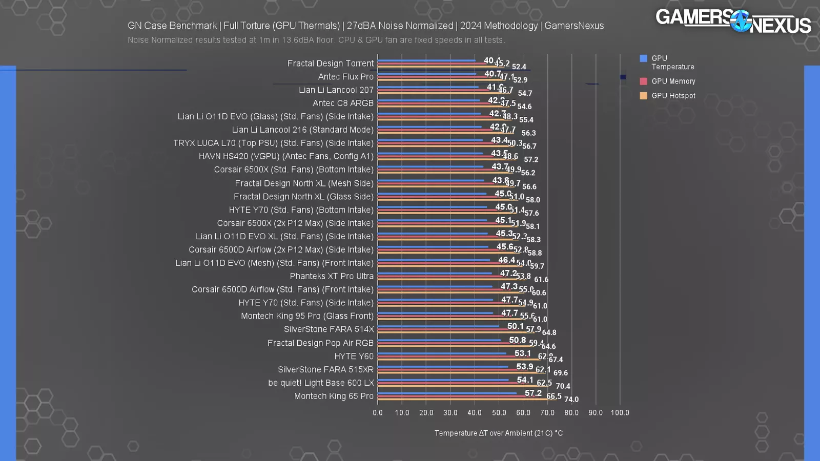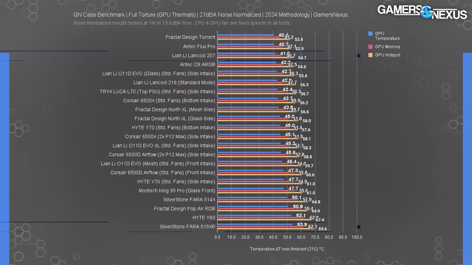 In the noise-normalized GPU thermal test, it outperforms the Lancool 207 and ties the Torrent (watch our review) for GPU die temperature.