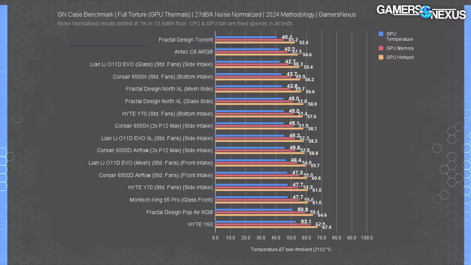 Noise-normalized thermal tests are the most important performance benchmarks we run on cases. With the current iteration of our bench, we place the case on a table in our hemi-anechoic chamber with a mic pointed directly at the center of the front panel from one meter away. Then, we lower the speed of the case's stock fans in tandem until we hit our chosen threshold of 27 dBA SPL. This allows us to level the playing field so that the cases with the loudest fans don't automatically land at the top of every single chart by brute force. It creates a control.