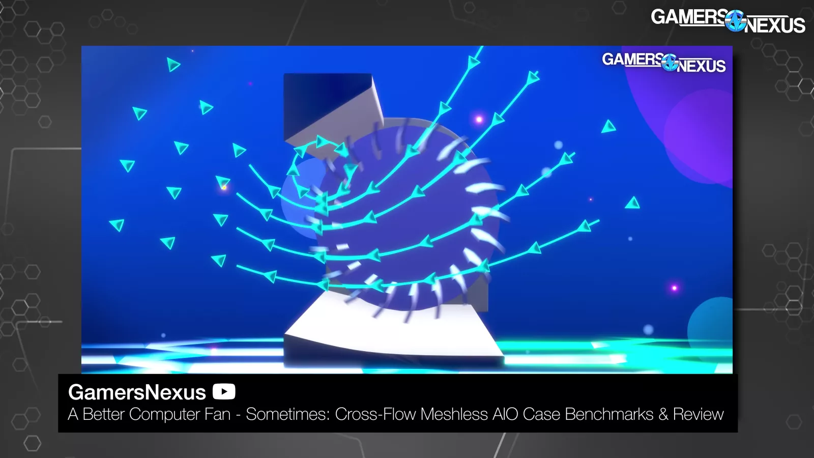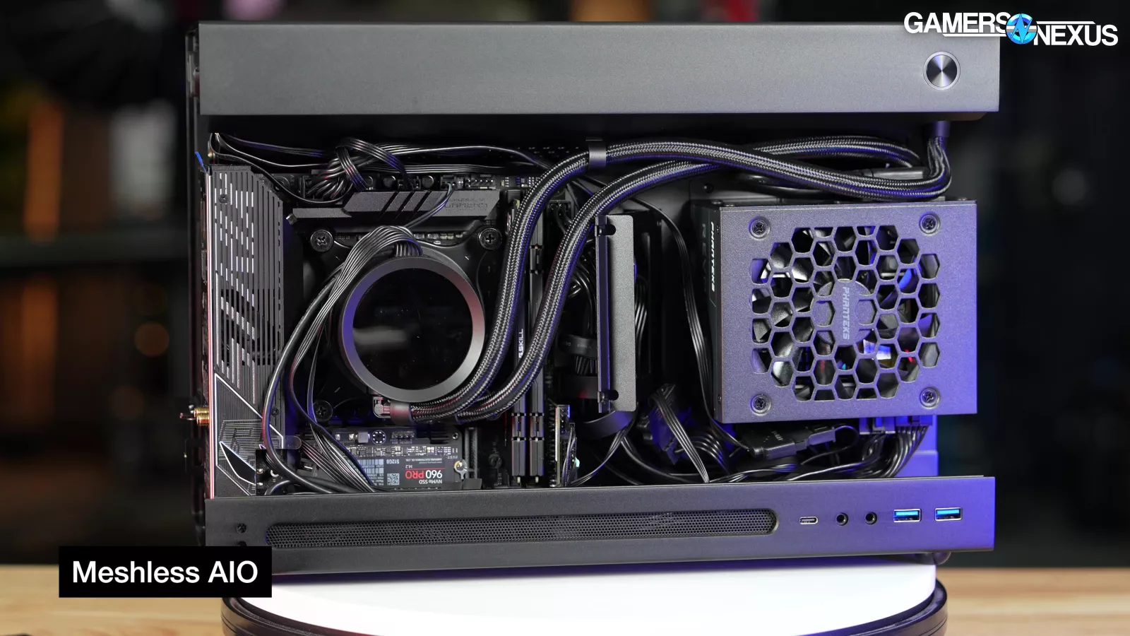 The Meshless AIO (now apparently listed with a formal launch name as the “MD280”) is built around a cylindrical crossflow fan, like a smaller version of the fan in a mini-split wall unit. We found the case design curious enough that we built this 3D animation to help explain and educate on how these work. The basics are that the crossflow fan shoots hot air out at the upper edge of the side panel, and theoretically pulls cool air in everywhere else: towards the GPU fans from the side panel, through the radiator, and over the motherboard and PSU from a tiny strip of ventilation along the bottom edge of the case. In practice, we found that the GPU was better cooled by taping a couple of normal 120mm case fans to the top of the case, but these had other downsides in other tests.