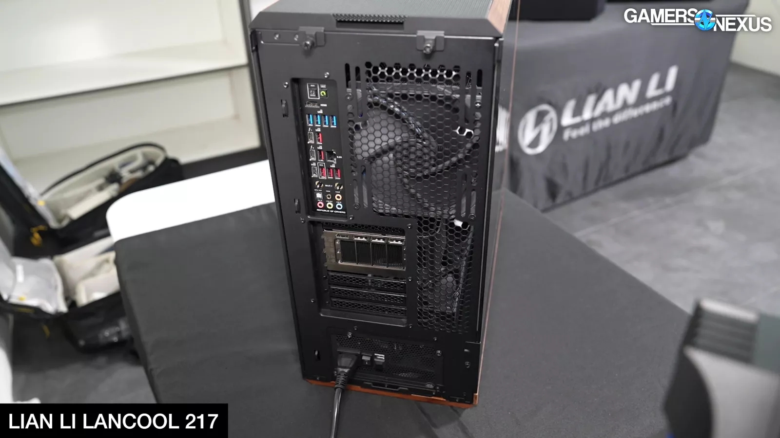 The more interesting of these two is the Lancool 217. The 217 is currently a prototype using walnut wood paneling to match the aesthetic created by (to our knowledge) In Win and later popularized by Fractal. The prototype had several scuffs on its misaligned wood panels, but Lian Li tells us that these are related to the hand-made nature of the prototype unit.