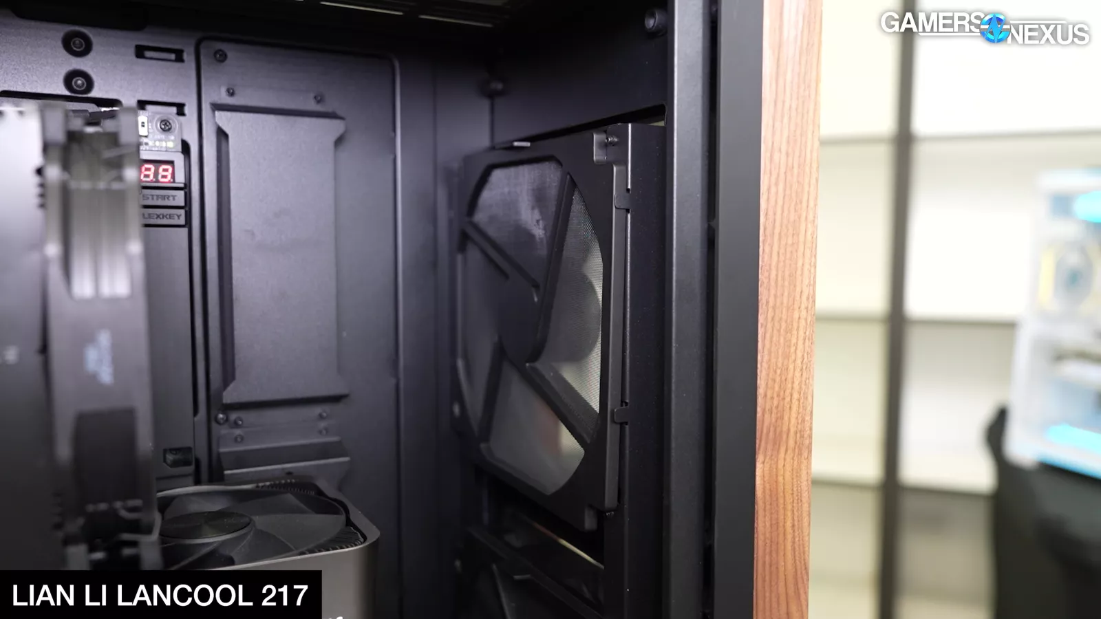 The 217 uses a rear 140mm fan and a strange mix of 2x 170mm large fans in the front panel. We've seen 160mm fans on some cases, including Lian Li's own, and 180s are popular on several popular cases (including the Fractal Torrent), but 170s are rare. Lian Li chose 170s for the simple reason that they're the largest size that'll fit without scaling the case wider to accommodate 180s. The company also lined the fans up with a separating block in between, shifting the lower 170mm fan down further. This forces its air into the PSU chamber to eventually find its way up into the GPU side of the video card, theoretically more evenly distributing air across the full surface of the video card rather than focusing it primarily on the power side.