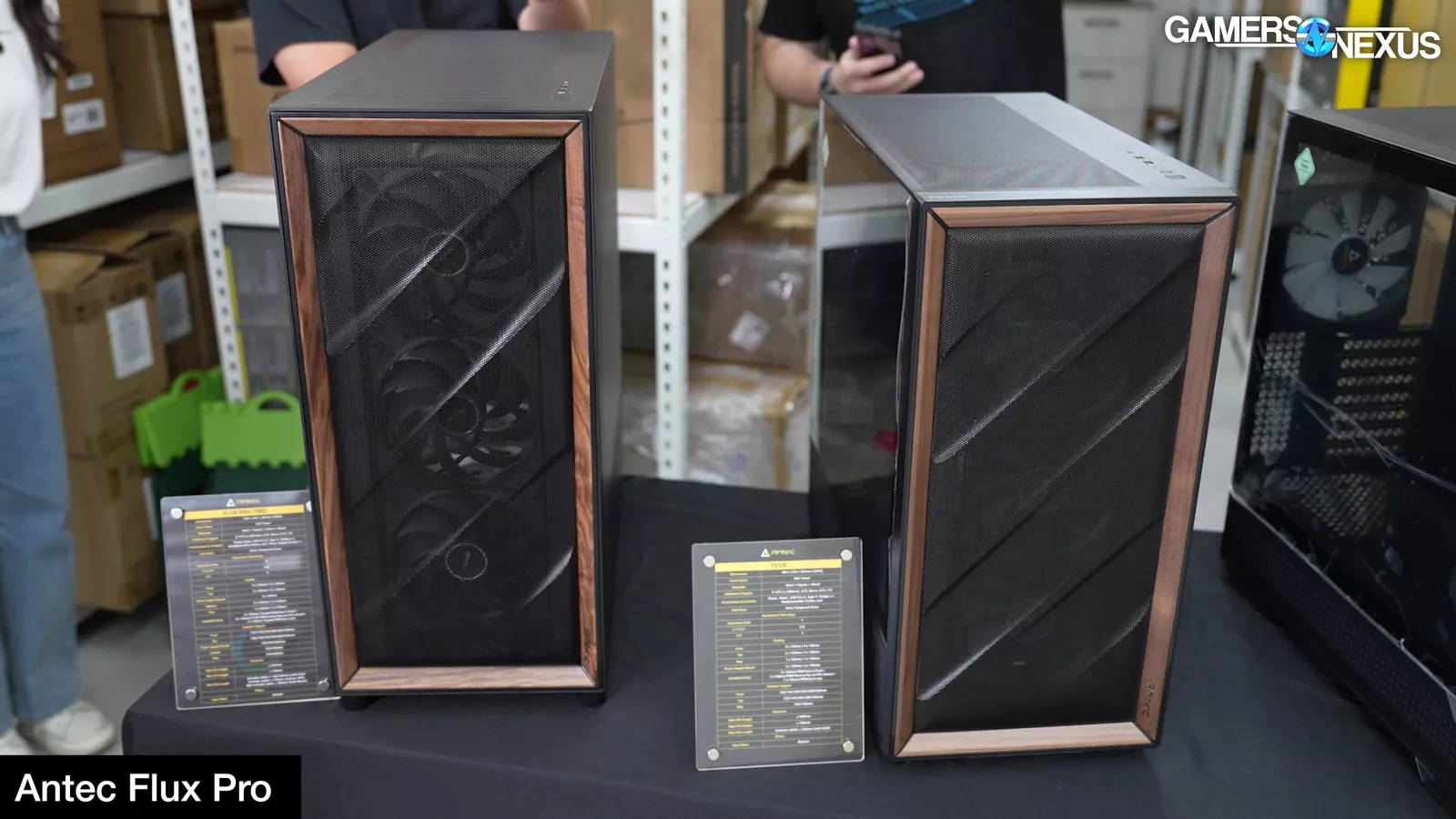 Up next is Antec's return with the Flux Pro. The Flux Pro uses entirely new tooling and has an American Walnut wooden outer border combined with a rippled mesh front panel, reminiscent of its prior Flux cases. Antec is getting competitive on price with these cases: It intends to ship the larger Flux Pro with 6 fans, at 4x 140mm and 2x 120mm reverse blade fans, for $170-$180 in August. The direct price and size competition includes the larger Fractal North XL.