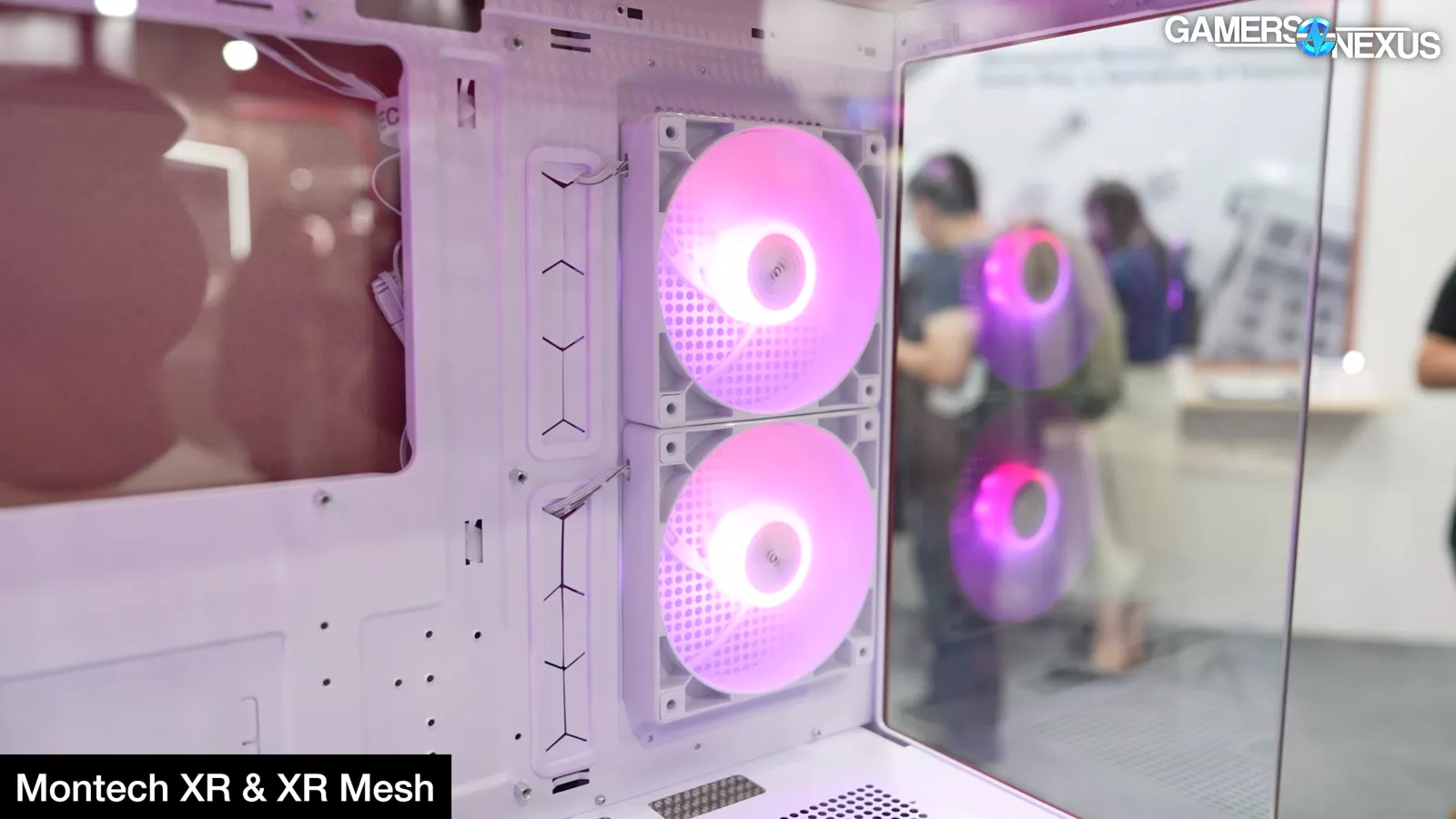 We'll shift focus to the XR first: The Montech XR case comes in either a glass fish tank style with 3 fans or a mesh panel, wood-embellished variant with 4 fans named the "XR Mesh." The fish tank is $64, the Mesh is $70. The XR Fishtank includes 2x 120 reverse side fans and 1x 120 back fan, all ARGB. The tooling is somewhat repurposed: Montech says it took its Sky 2 tooling and scaled it. The Mesh variant has 3x 120mm front fans and 1x 120mm rear fan, with a wood plate that feels thrown on for the trend, but simultaneously doesn’t look bad. The interior chassis is incredibly plain and has no ease-of-installation features that are particularly strong. It’s basic. The strength of the case is brute force air movement as cheap as possible, which has been an underserved market for the last few years. The XR just released and we plan on buying one to review as soon as our schedule clears.