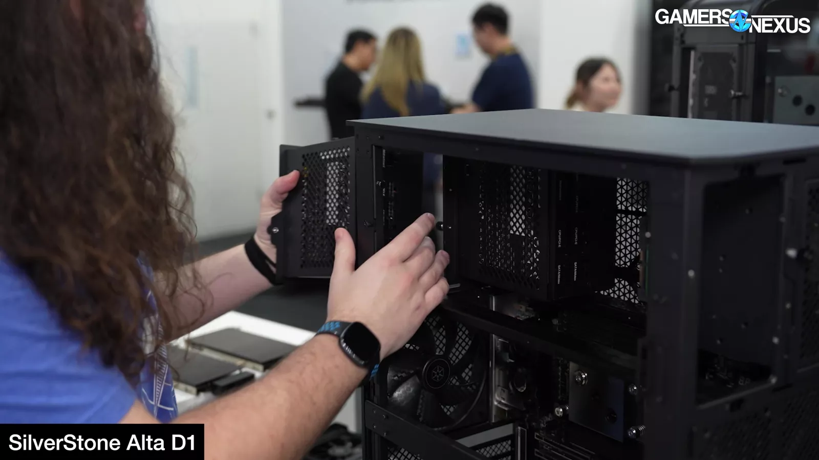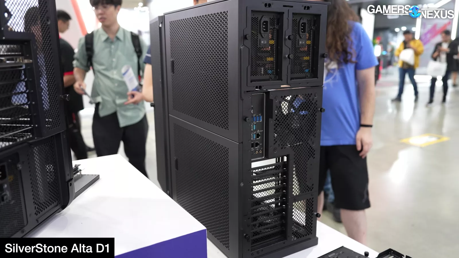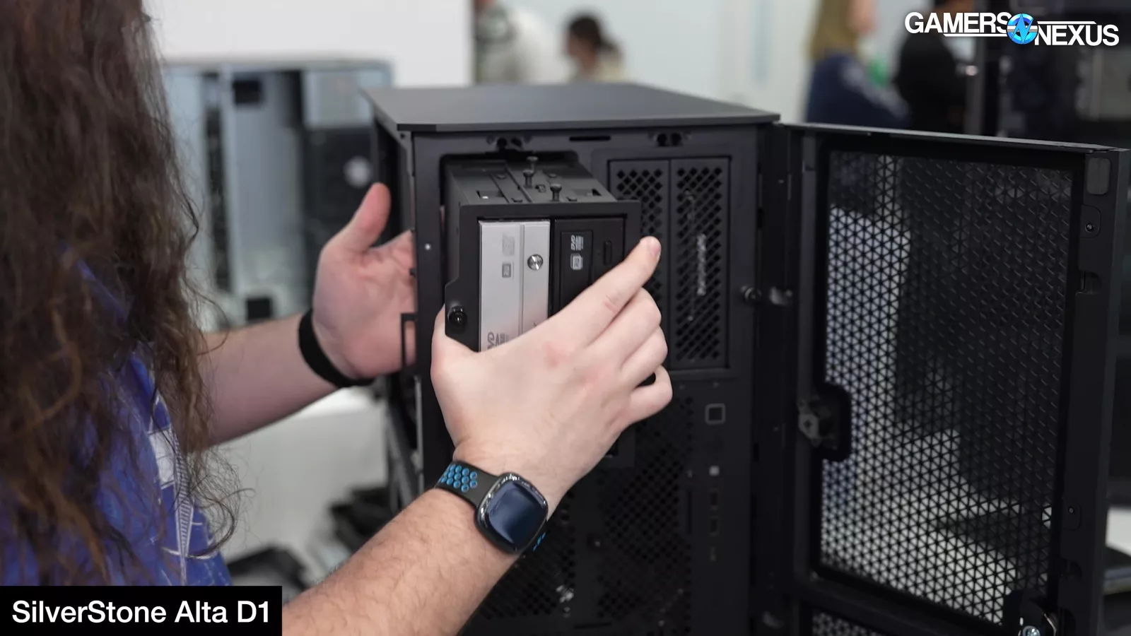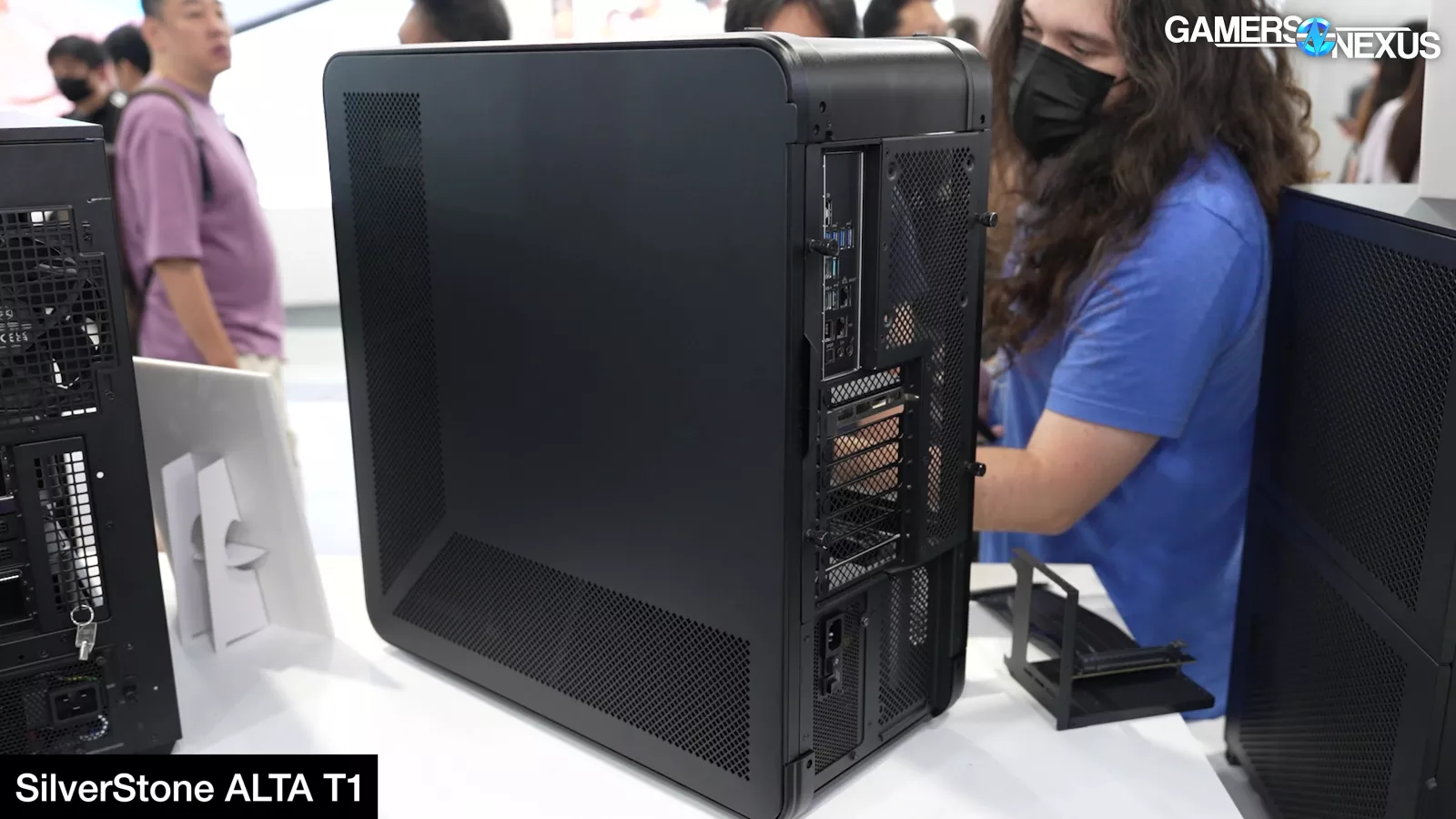The Alta D1 is a taller form factor tower that's big enough to need a cross-brace across the center of the chassis for stability. SilverStone doubles this as a mount for the vertical GPU support bracket. The D1 uses thick aluminum for some of the panels, like the top, and uses a split rear side panel for better structural support and cost. The front panel is hinged and has a keyed latch. The D1 will launch soon and has an unknown price at the moment -- but SilverStone openly told us that it'll be high. We were told to expect closer to $1,000 than not. Despite its inevitable low viability for most people, we wanted to highlight it for doing something unique while remaining functional.