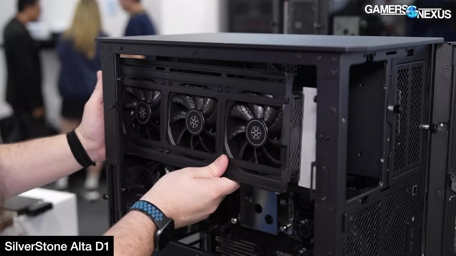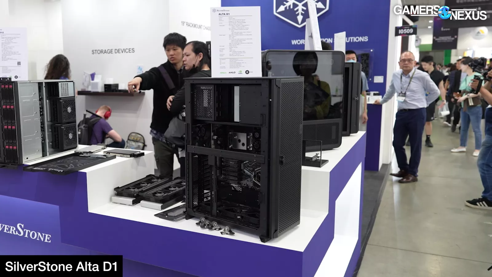 The show build had about 32 fans installed and two systems (one ITX and one ATX), but doesn't focus on the functional storage afforded by the AX700 as much. This is another one where we liked the smaller attention to detail: The pre-greased rails and actuation for the fan and radiator trays were nicely done and the small fan size markings on the rails makes installation clearer, reviving the 1000D highlights of the past. Corsair doesn't reach SilverStone levels of pure mechanical functionality and quality of life features in a huge case, but it also comes in cheaper -- but still not cheap. The 9000D will be around $500, but is expected to be a lot cheaper than Silverstone’s D1.