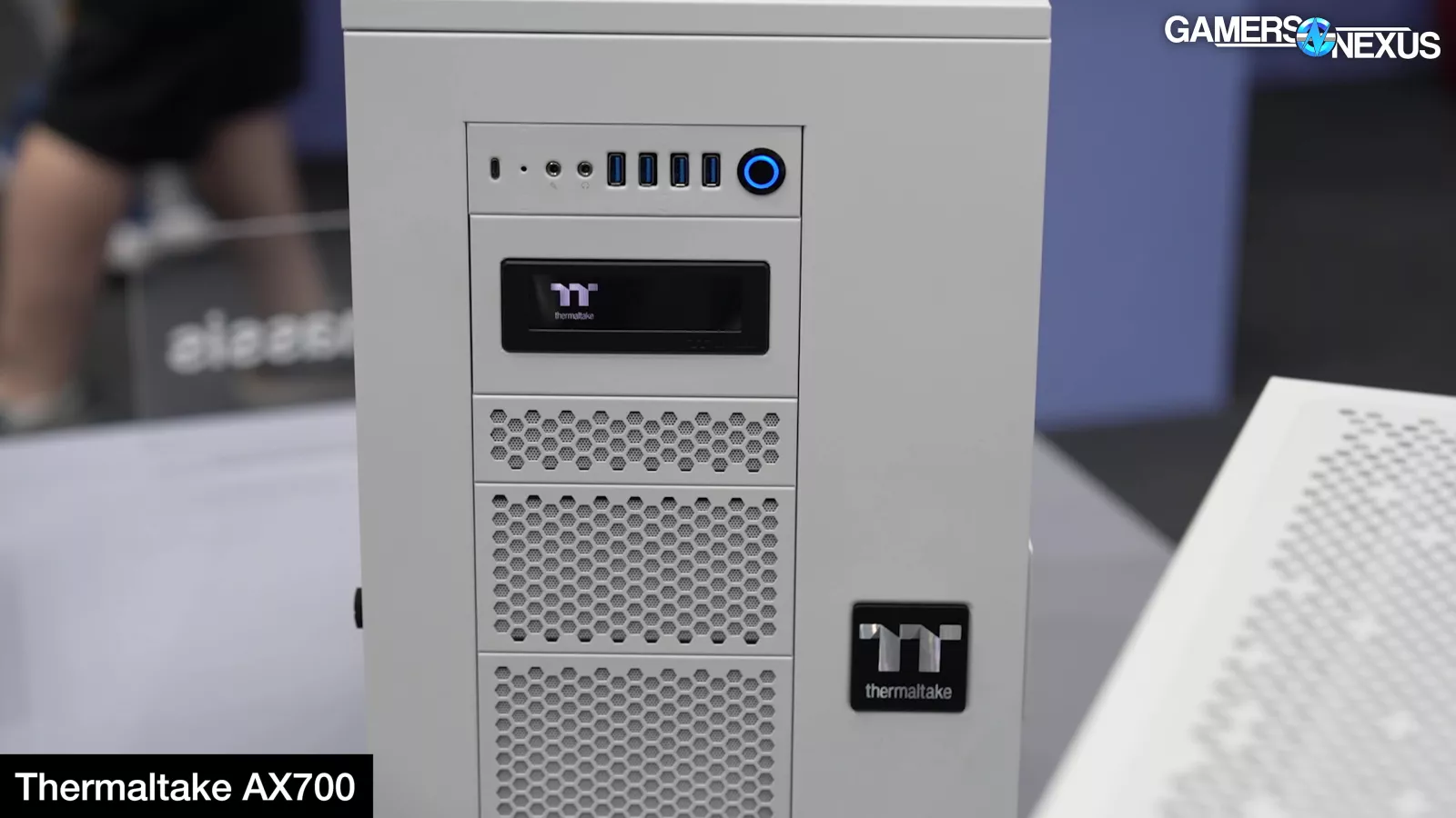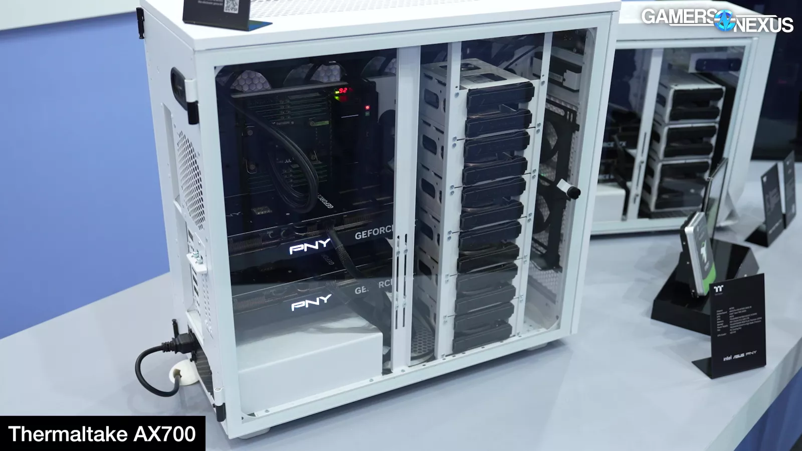 We'll change things up again. Thermaltake had a ton at its booth this year, but we wanted to highlight what’s technically an older case. The Thermaltake 100 case has had its tooling refreshed for the new AX700 workstation case. The case is an absolute monster and it remembers why big cases exist. Rather than a big empty glass cube, Thermaltake still includes a lot of drive cages. The show build had space for 12 hard drives mounted to the vertical rail, but another 2 drives could be mounted without the radiator in the way, and the backside of the motherboard tray would support at least another 2 drives from what we could see at the show.