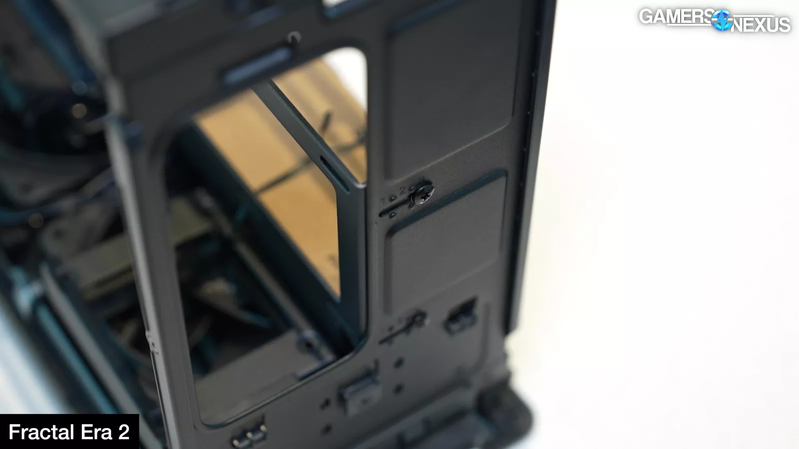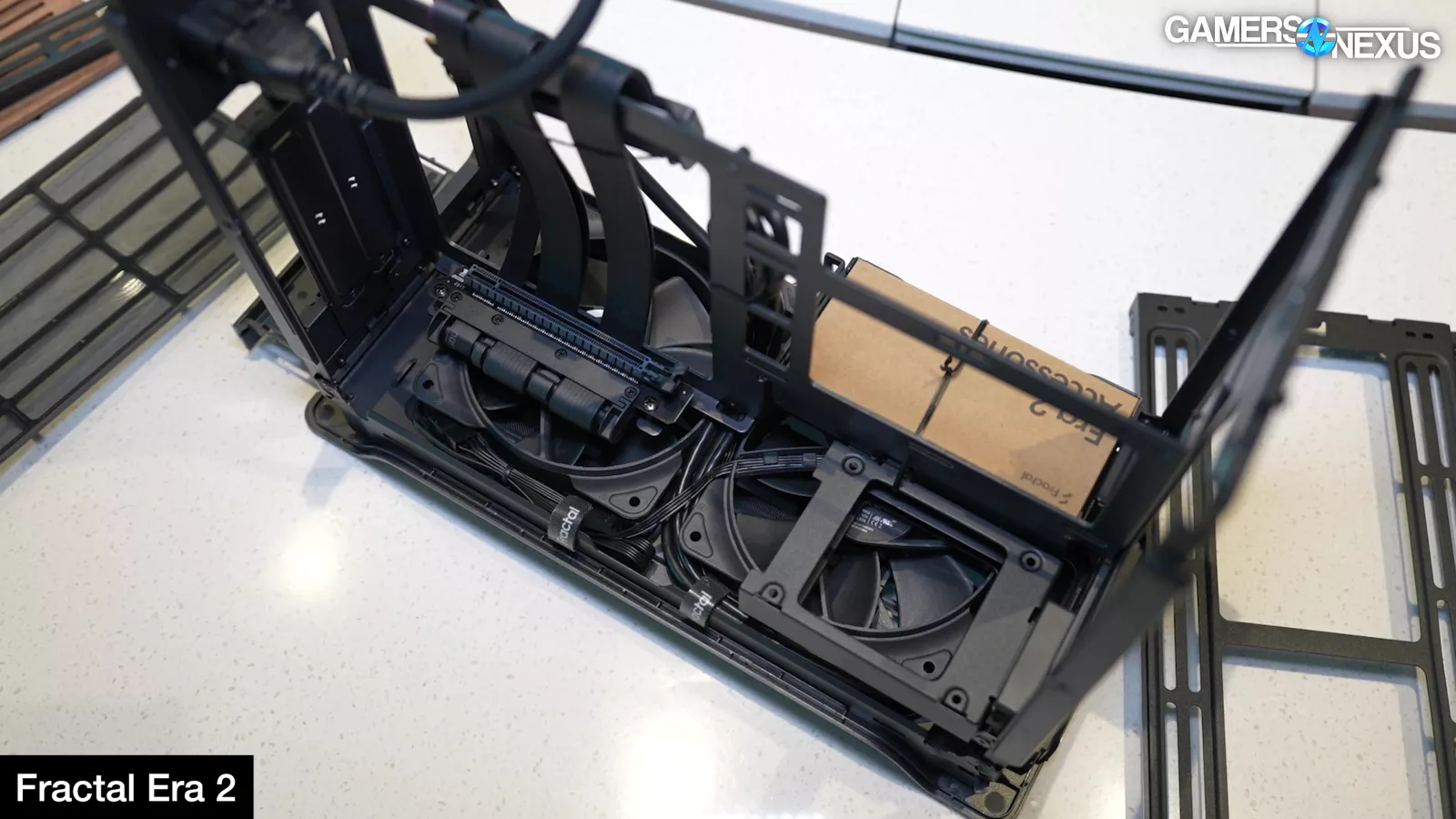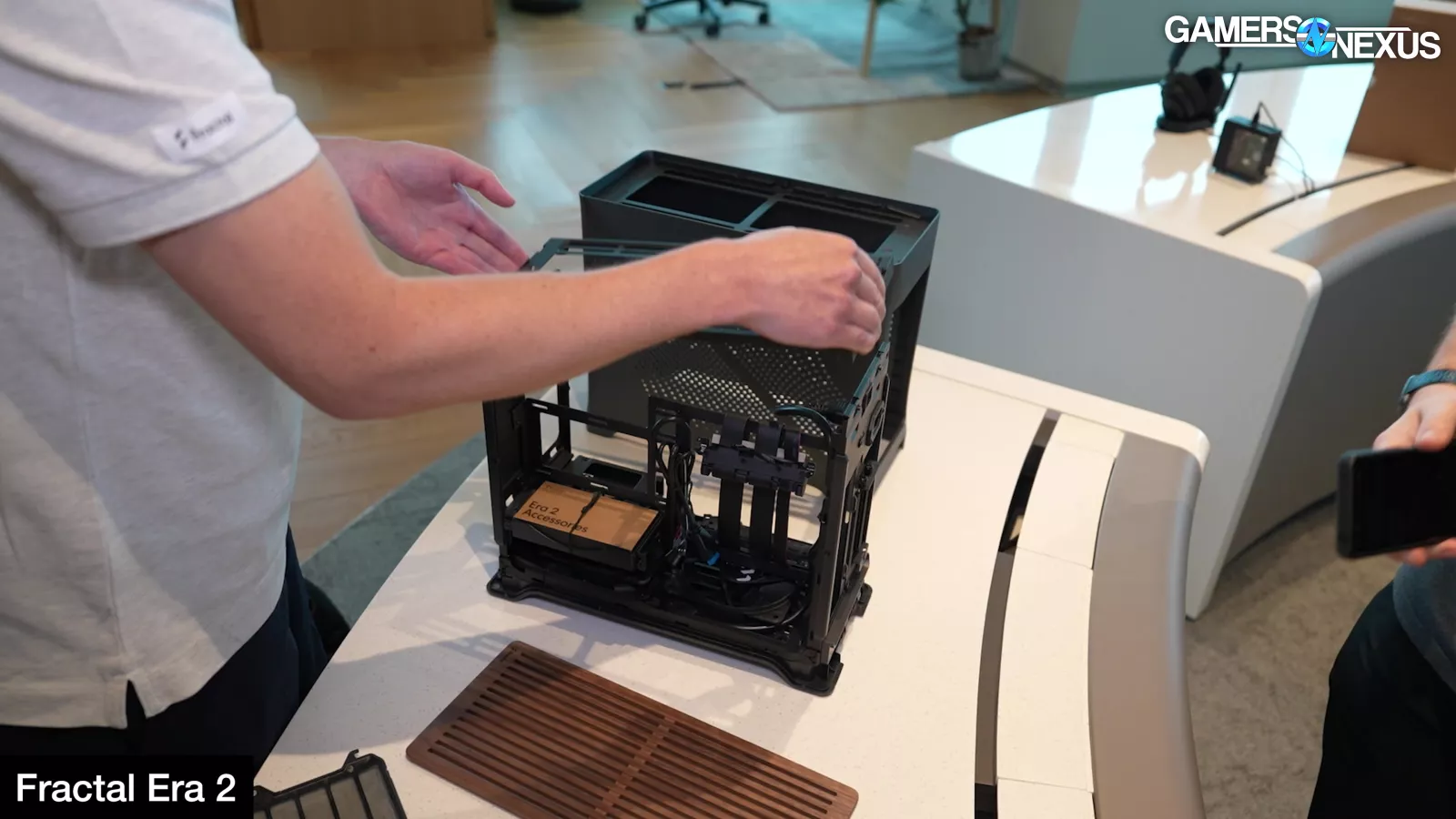 The Era 2 has clever mechanical design to allow the exterior chassis to easily lift off after a bottom filter is unseated, making the chassis easy to get into for building or maintenance. The top panel also has some mechanical latches that release it for full access inside the case. It’s an 18.9L case with 2x 120mm basement fans included, a PCIe Gen4 riser, and a Terra-style spine that shifts slightly side-to-side to better accommodate GPU or CPU cooler clearance.