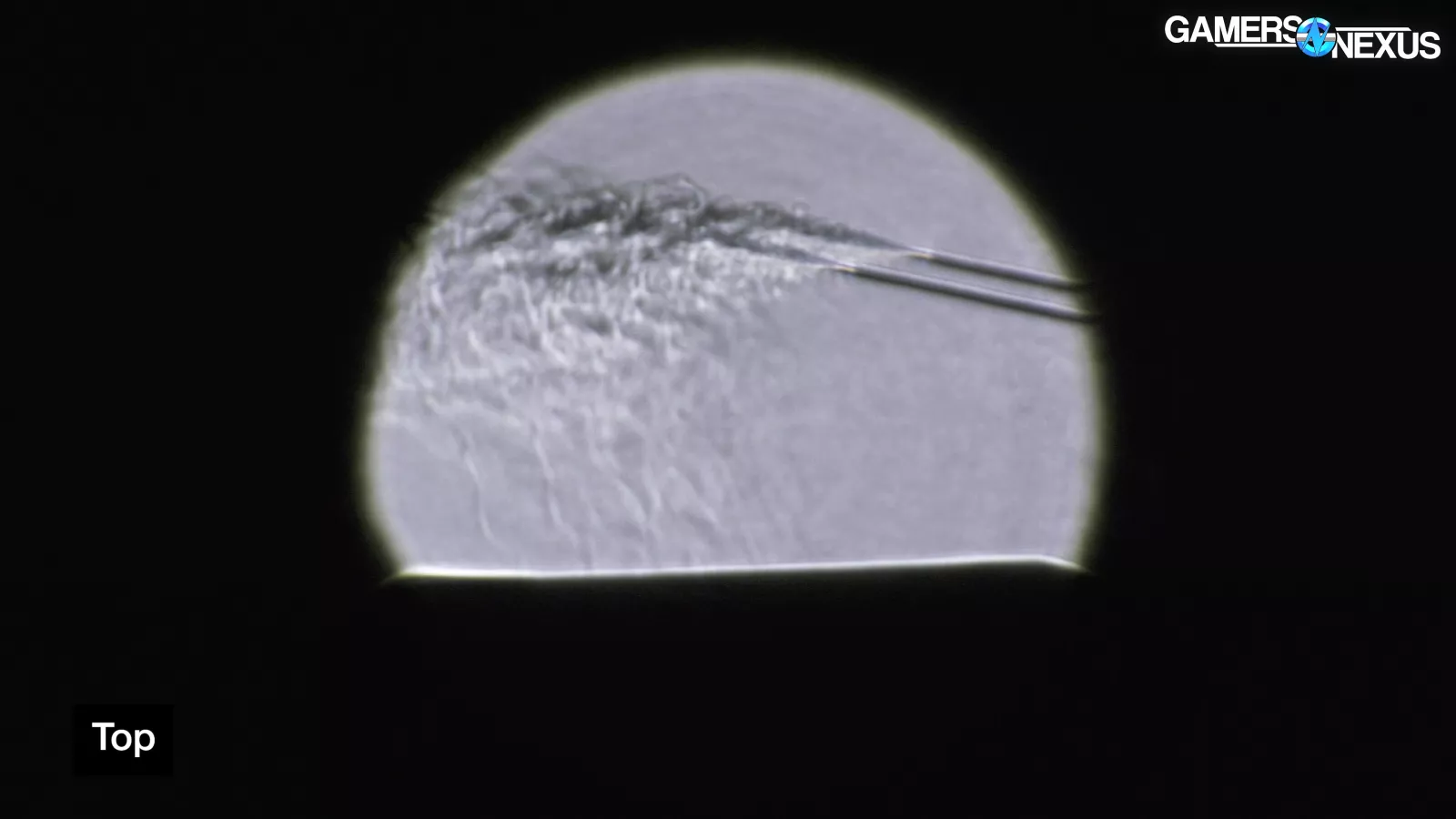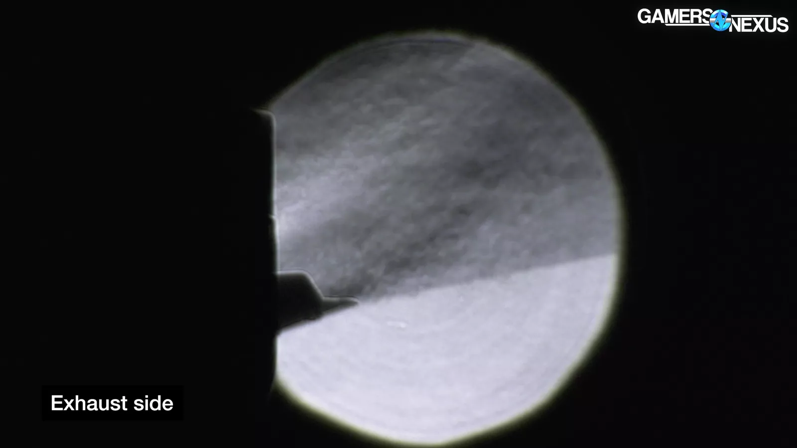 We were curious if the rear was acting as intake or exhaust. You can see that it’s exhaust: The air is flowing out of the case thanks to the video card’s fans. There is some very slight air intake at the bottom-left of the frame at slow speeds.