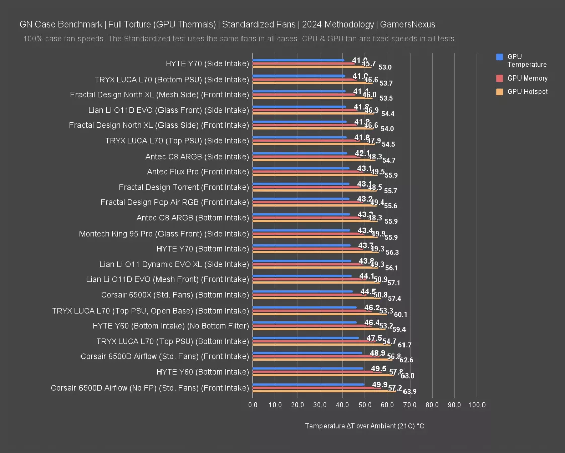 Using the baseline side intake numbers for comparison against other cases, the L70 actually did fairly well, with the Y70 averaging 41 degrees above ambient for the GPU (versus the L70's 42) and the O11D EVO XL averaging 44.