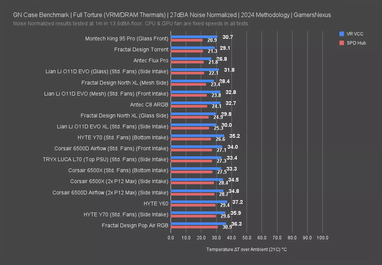 Back to the noise normalized test and with stock case fans where present, the GPU averaged 43 degrees above ambient. That’s better than the O11D EVO XL side intake at 45 degrees and the Y70 side intake at 48 degrees. Memory junction and hotspot temperatures followed the same order. The other cases on this chart used their own stock fans if available, which means cases like the Torrent and Flux Pro that ship with serious out-of-the-box cooling gained back an advantage that they lacked in the standardized fan test.