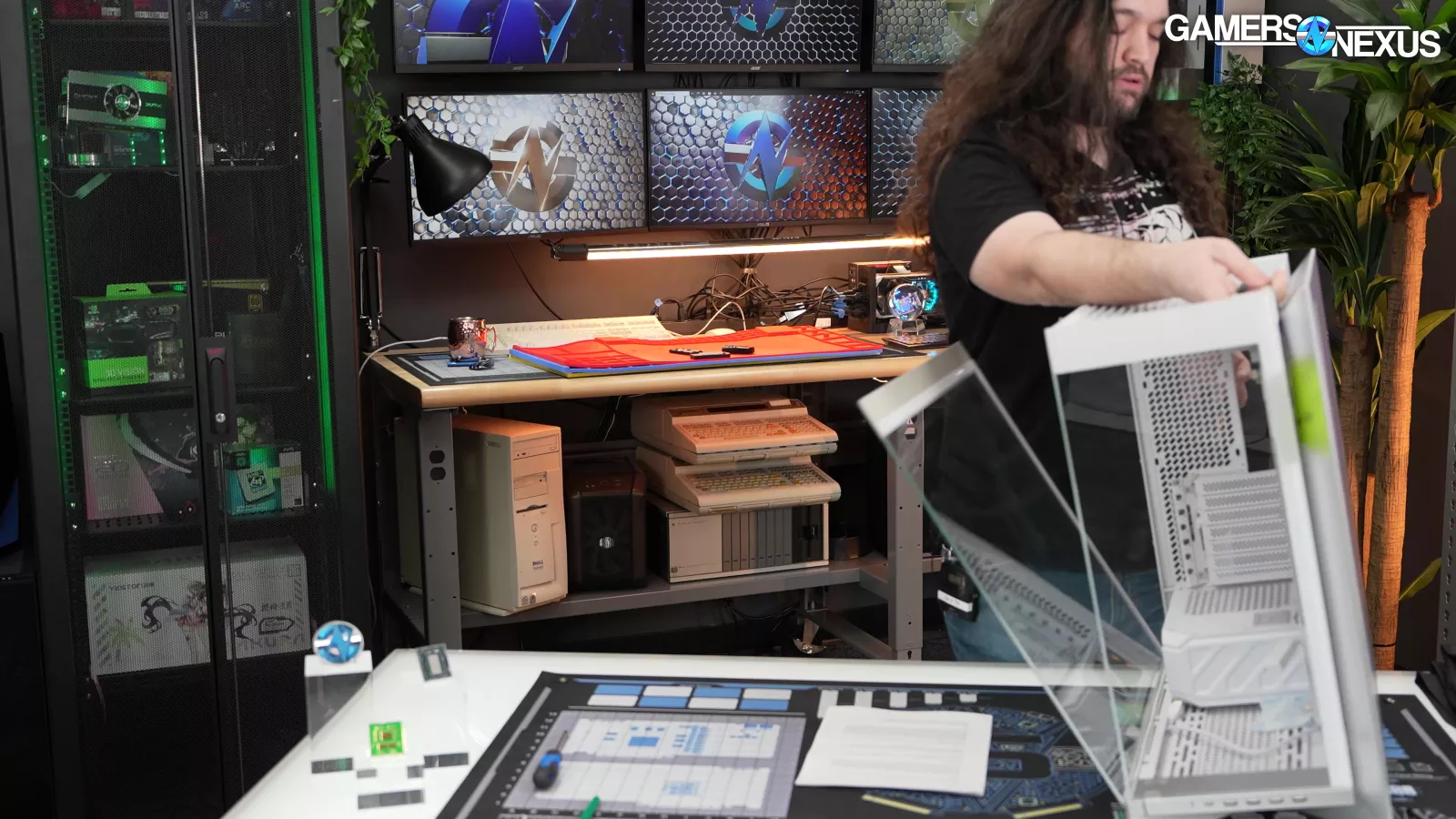 Now we’re moving to standardized fans in all tested cases on the chart, all set to 100% fan speed, with the CPU and GPU fans remaining controlled and fixed as always. This means every case on here has the same fans, which also means some cases -- like the Antec Flux Pro -- will be worse than stock, as we are reducing the fan count. The test is still useful for looking at standard airflow patterns in a controlled way and is one we run specifically because our audience heavily requested it.