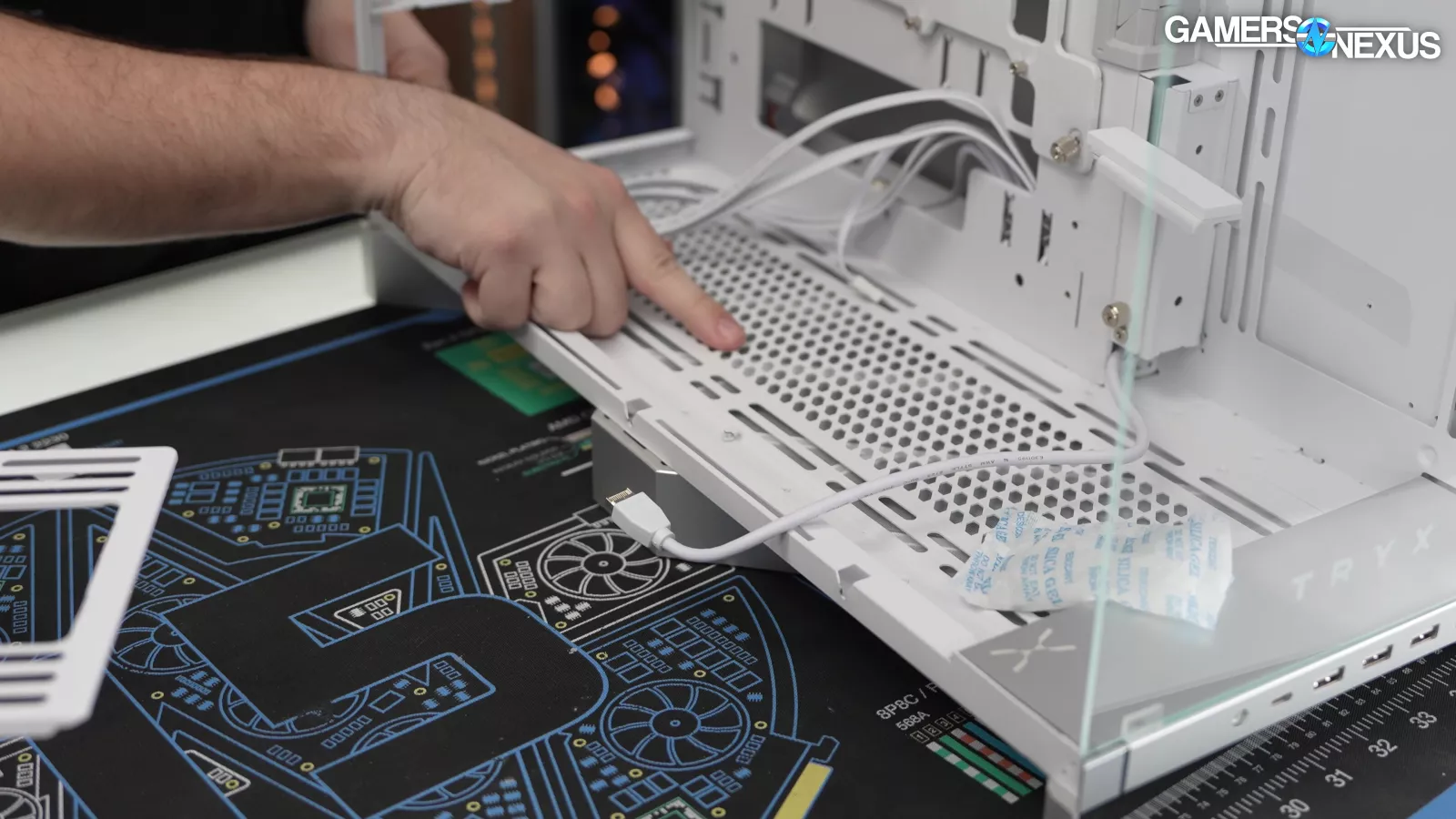 The Tryx L70 has an ASUS ROG look to it, specifically reminding us of the old Strix Helios: it's big, it's expensive, and there are huge chunks of aluminum, which is an expensive material. We weren't impressed by the Helios based on its price and thermal performance, but we've also kept one in our set background for months because, like the L70, it's impressive to look at.