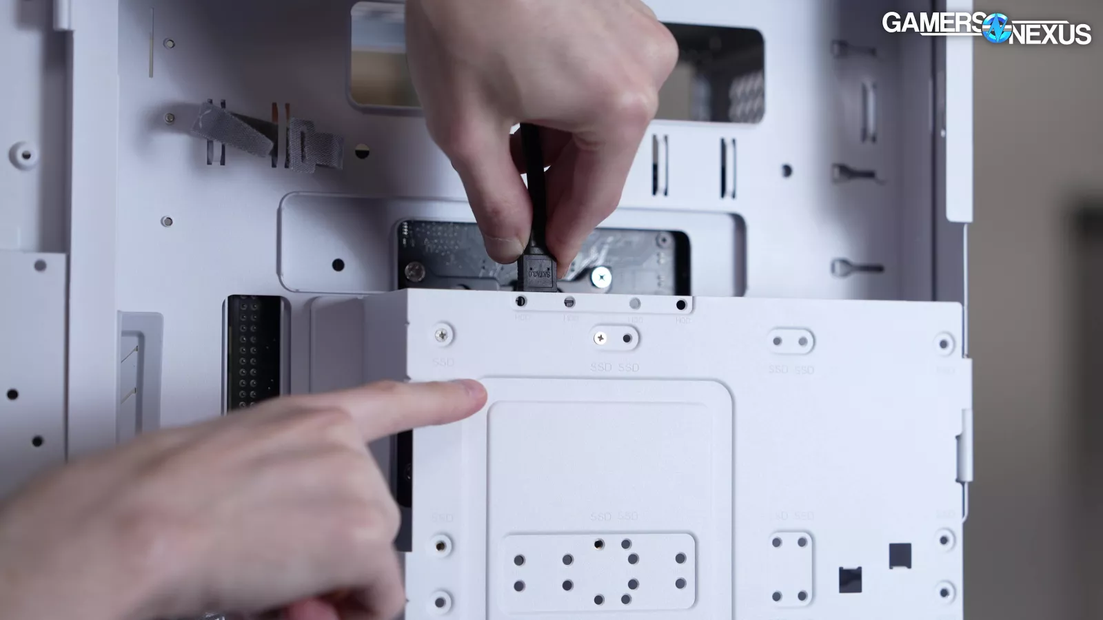 The SSD bracket can either open or close the side vent; in the closed position, the cables point the wrong way, and in the open position, cables can't fit past the other bracket. None of this was designed well in our opinion. If you do get a drive in there, you won't be able to access the cable retention clip. The other SSD/HDD bracket has raised areas that conflict with some of the 2.5" mounts, and depending on the case configuration, the slots at the back may strain your cables to their limits.