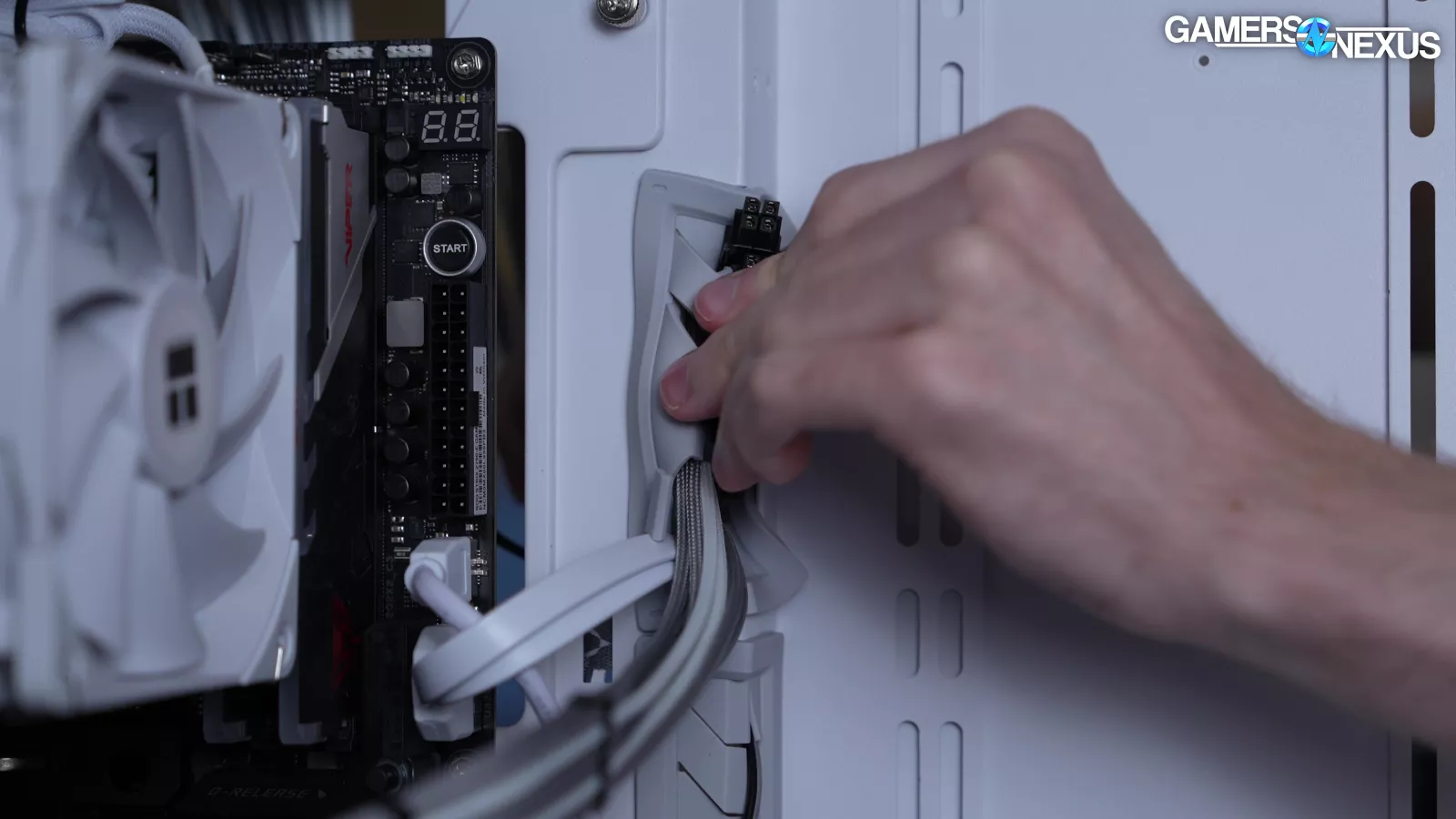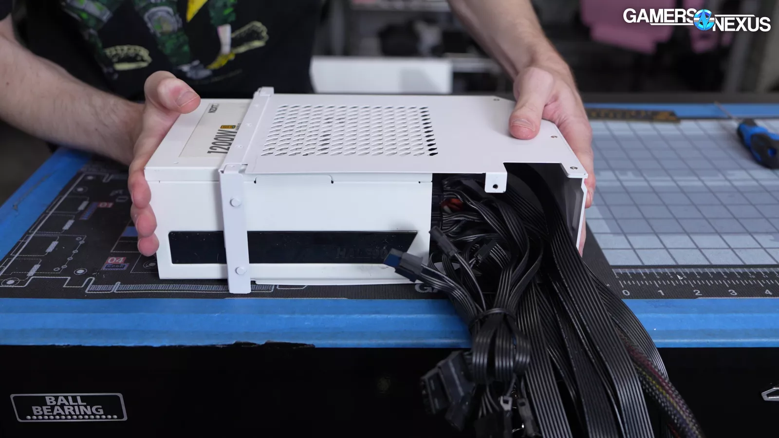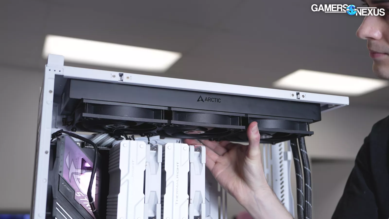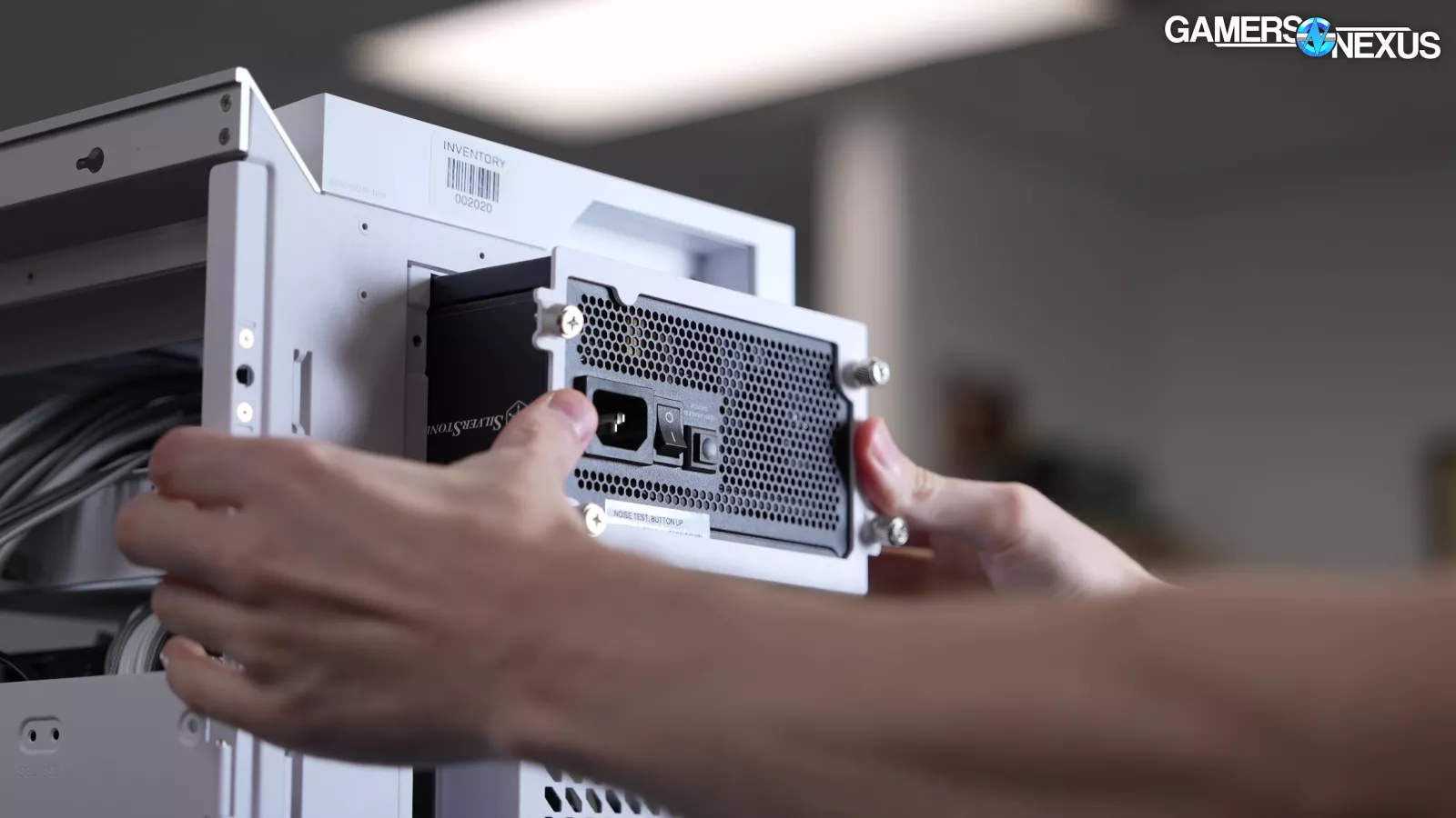 For our baseline test, we ran the case as it shipped with the PSU at the top of the case. We kept the PSU fan-side-down as depicted in the manual, which means it should help with CPU thermals by pulling exhaust out of the case. The PSU's zero RPM mode is always turned off during our case thermal tests.