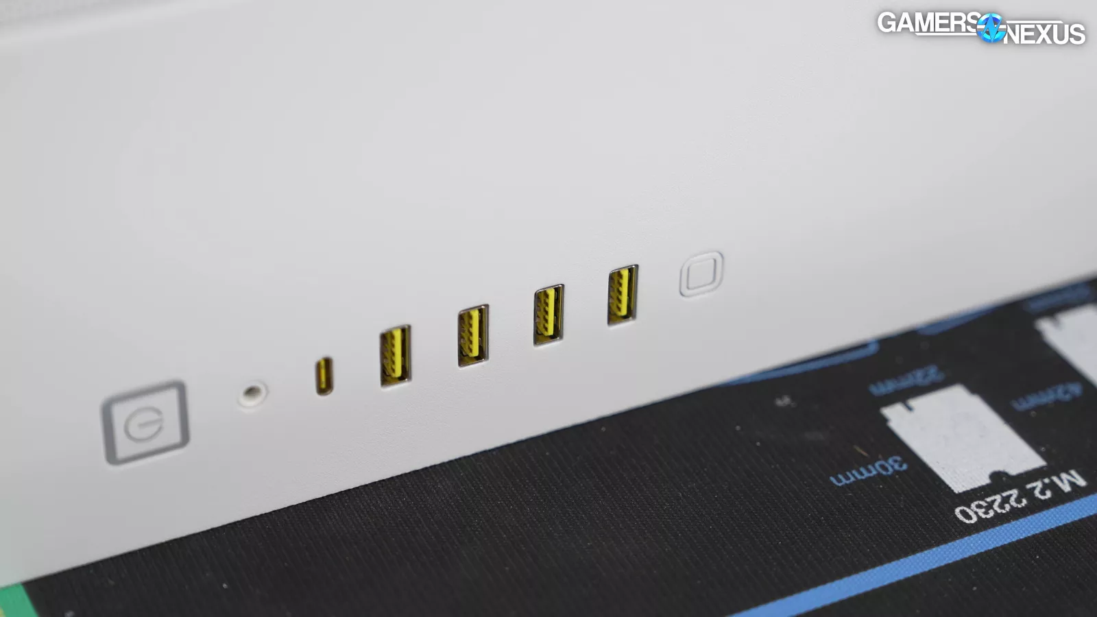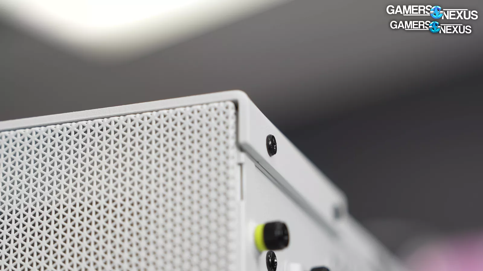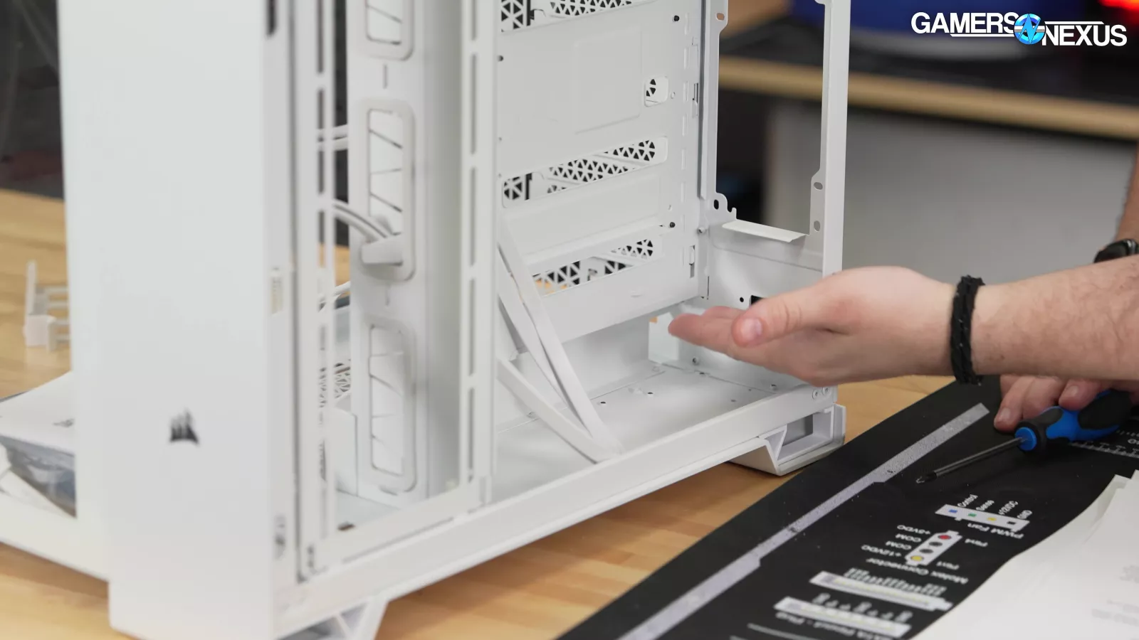 The company’s back-connect compatibility conflicts with its drive cage compatibility in ways that seems like one of the two was designed in isolation of the other. Corsair’s filters on the case are large and loose fitting without sufficient integrated support, which means they sag. To prevent this where there are fans, Corsair has included what we’ve branded as the “oh-s***-moment” with an afterthought movable plastic structure to reposition where the fans are. The filter also pulls out from under the plastic panel supports. Corsair used heavy steel in areas like the top to create a valley effect in the front panel, but then likewise went cheap on the mesh panels. Instead of reinforcing the outer edges with metal to stiffen them, Corsair used a plastic border. The end result is that every panel on this case sags, no matter how charitably you orient it. The touches of yellow accent are a nice touch that Corsair has done before, but since they didn’t follow it through in areas like the pull-tab, which they've done before, the USB ports end up just looking like an area of going cheap (despite actually spending more) because it stands out as the only point of accenting -- and it happens to be a color from PCs of the 90s. Applying this accent with more purpose would have a better effect. Open loop hardware is technically supported but not well documented, despite Corsair making its own open loop solutions.