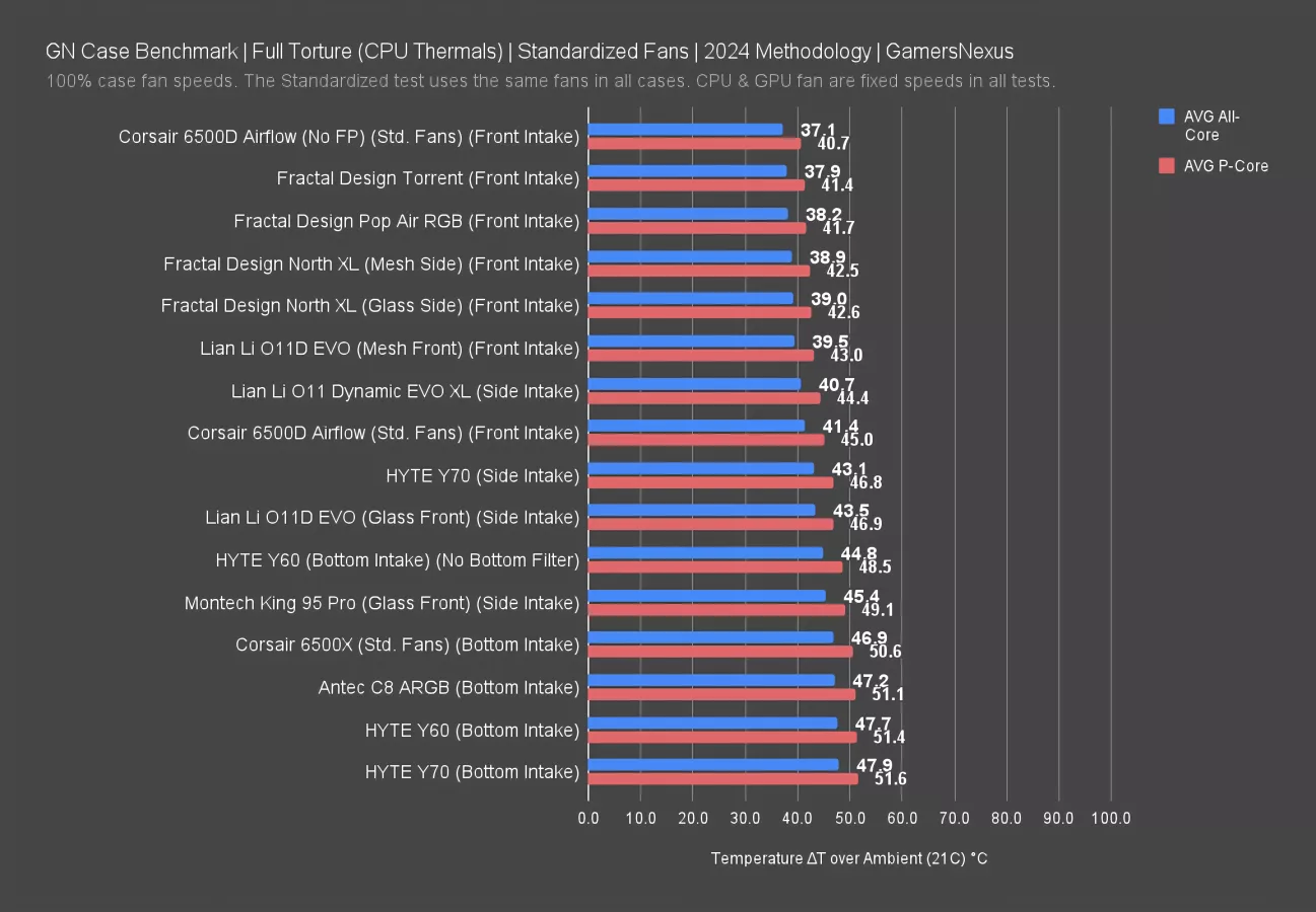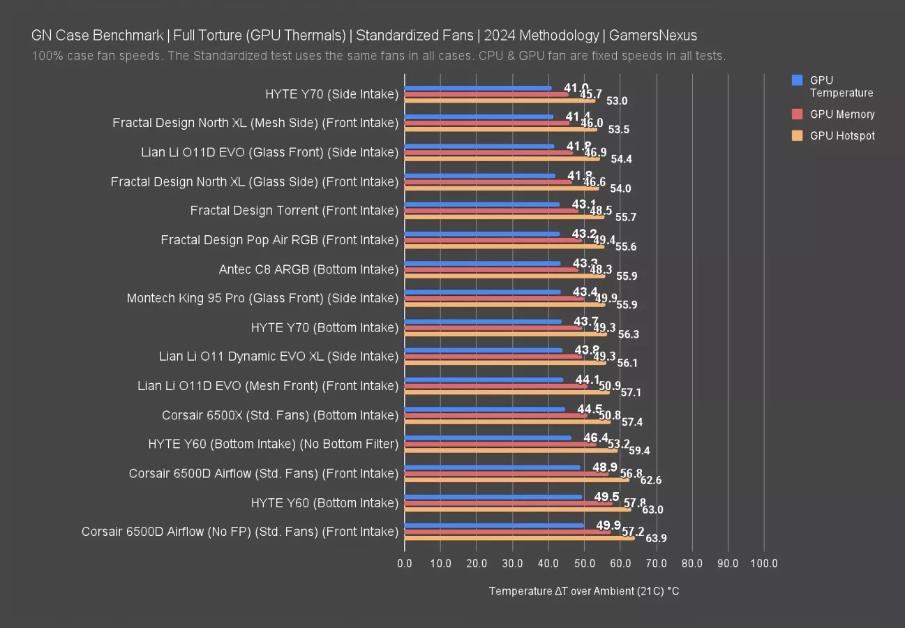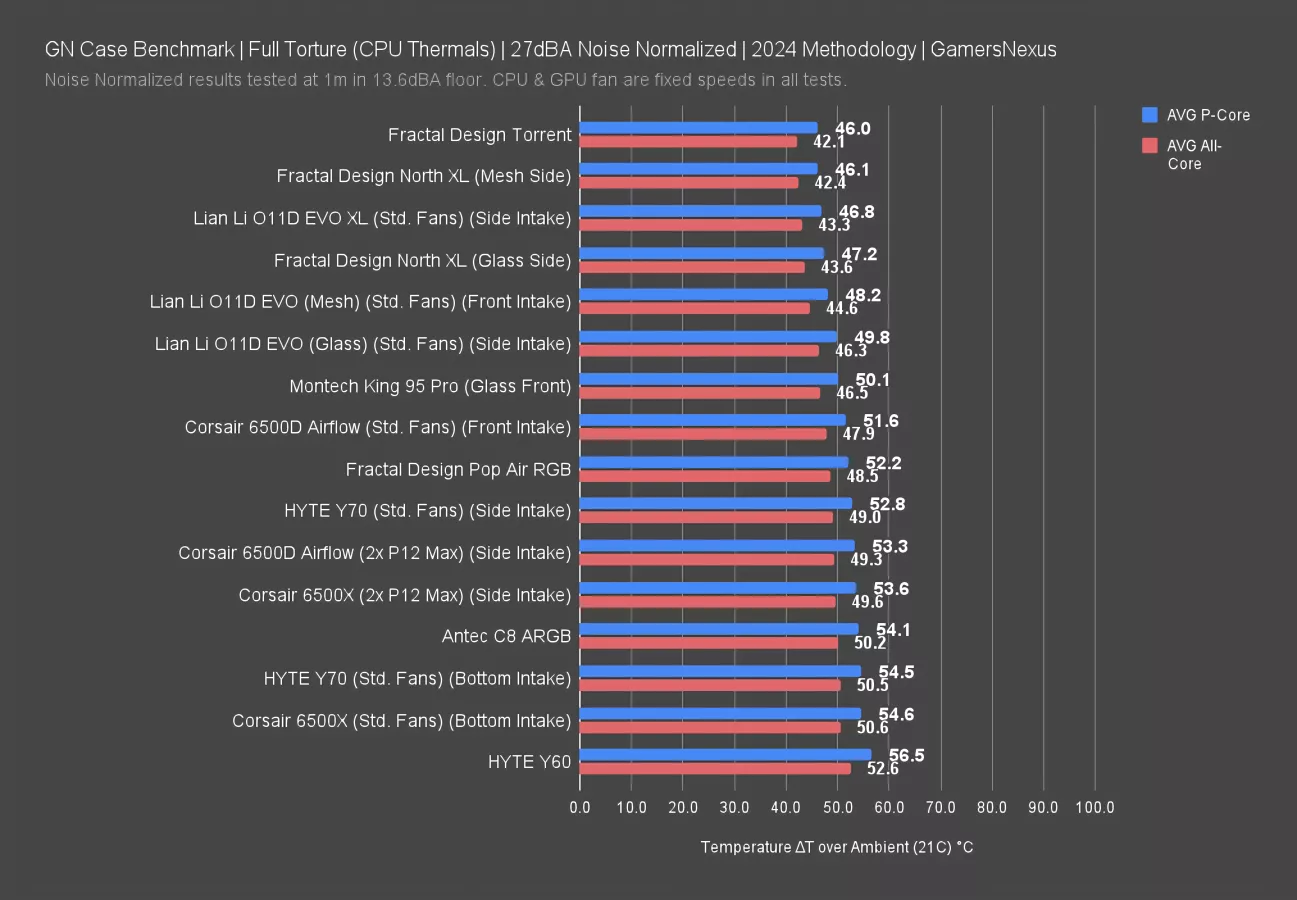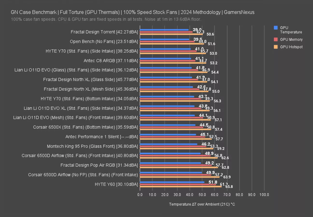 This chart covers our standardized fan test, where all cases use the same set of Noctua fans at full speed. These are not noise-normalized but do use the same fan speeds throughout the case.