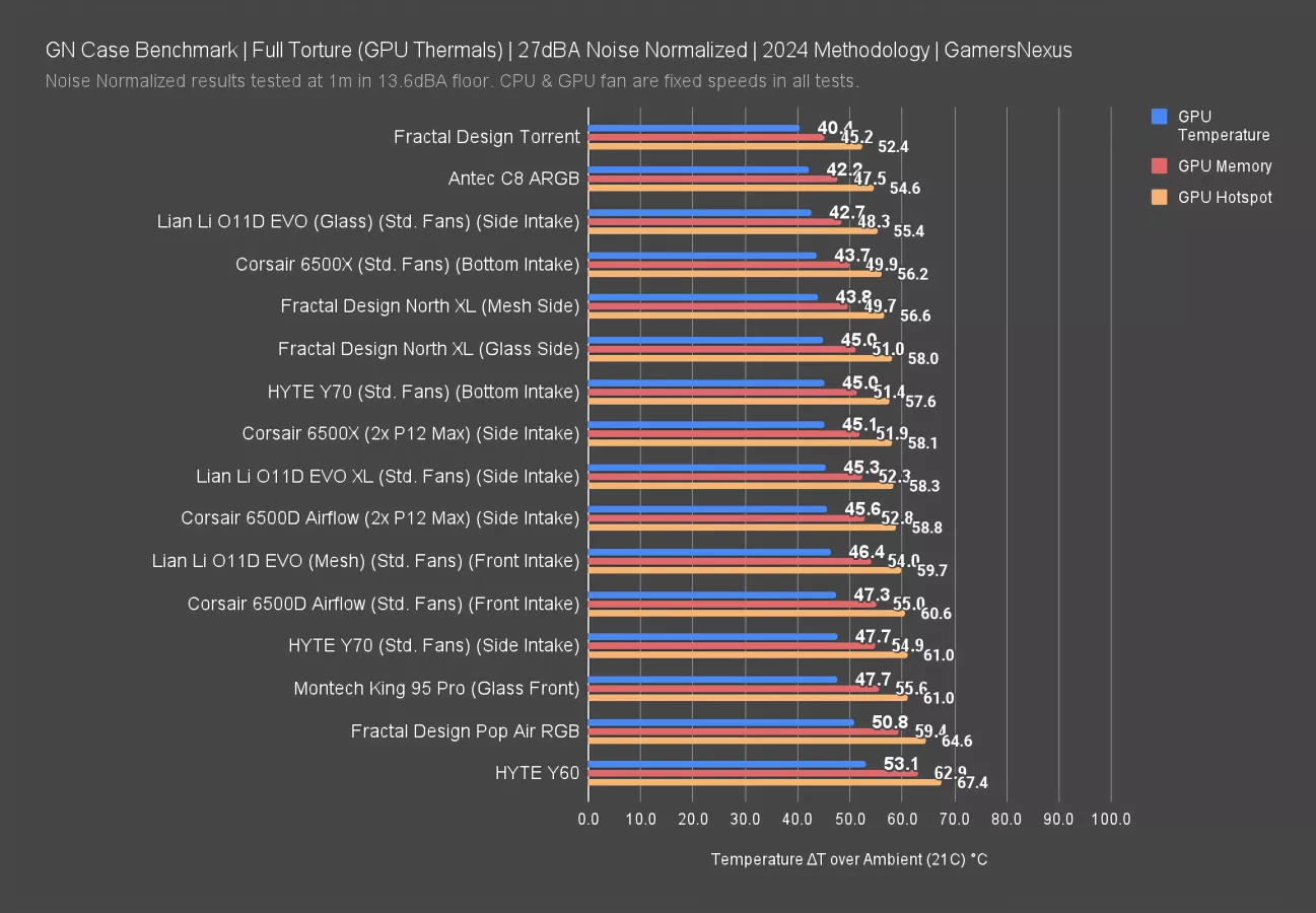 Front intake in the 6500D Airflow made it louder than the rest of the dual chamber cases on the chart, all of which were tested with side or bottom intake, but didn't put it at the same level of GPU thermal performance as the similarly loud 42.3dBA Torrent. The Torrent remains unbelievably impressive, keeping in mind this is with included fans and it has an advantage there -- but even from a noise efficiency standpoint, it’s doing well.