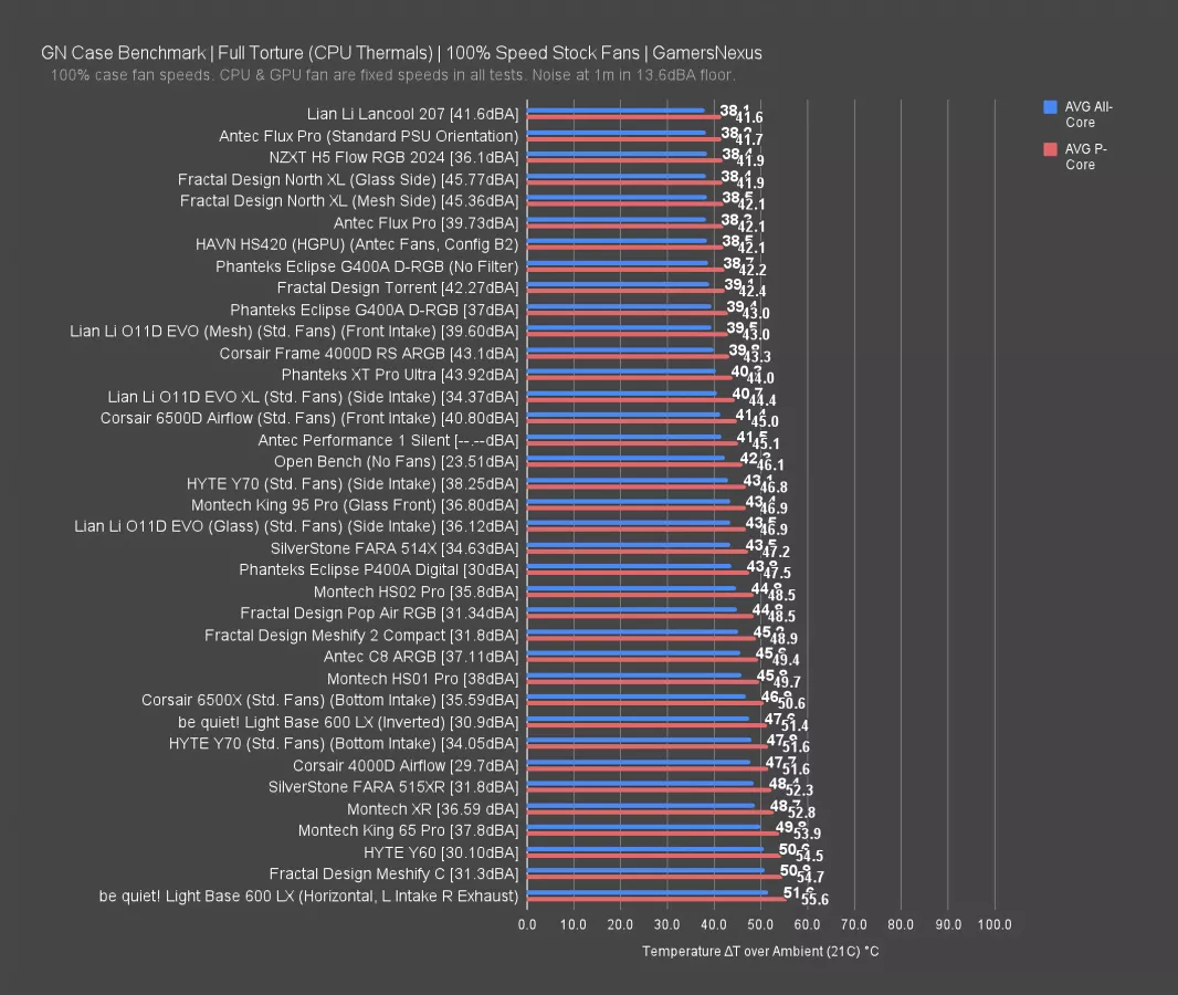 Relative to the rest of the chart, the Frame 4000D performed fairly well here. The Phanteks XT Pro Ultra is comparable in price and design, but it split the difference between the Corsair cases, with the Frame 4000D still a couple degrees cooler. The Lancool 207 (read our review) remains the budget case to beat with averages of 41 degrees across all cores and 45 on the P-Cores, while the NZXT H5 Flow 2024 (watch our review) and Phanteks G400A (watch our review) performed similarly well. The G400A remains difficult to find in the US.