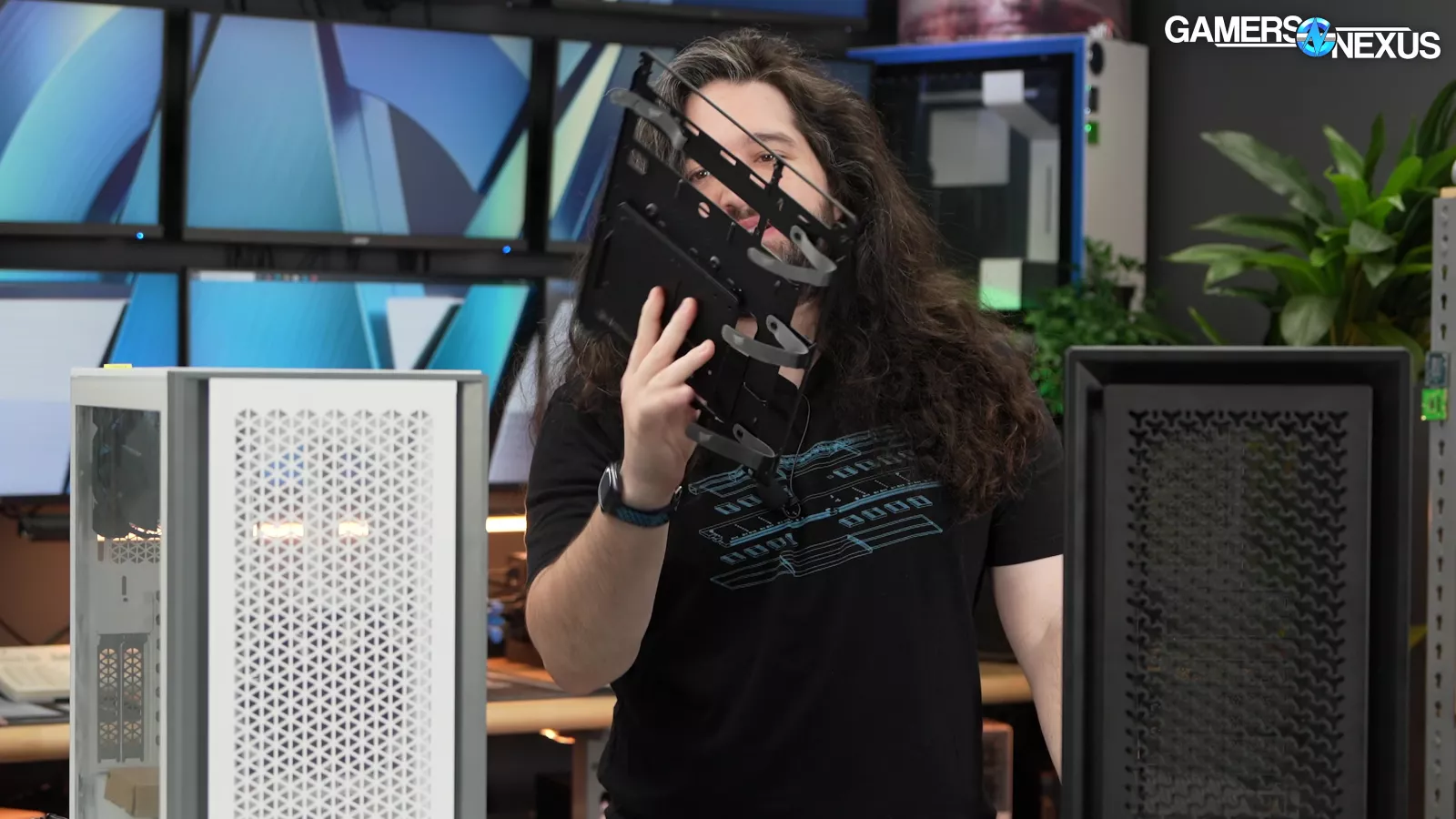 On the positives for build quality, the elaborate stamped 3D pattern on the front panel is much sturdier than it looks. We'll have thermal results later in this review, but the Frame 4000D's front panel appears more open than the 4000D Airflow's (watch our review) while retaining most of its rigidity.