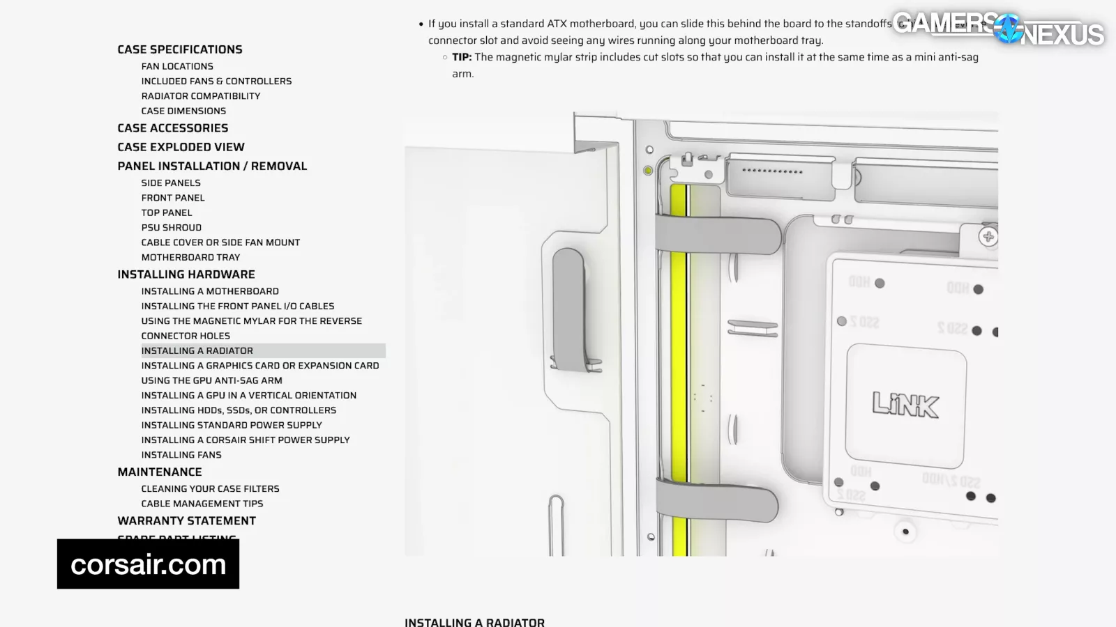We'd like to see a paper manual included with the case in addition to the version on Corsair's blog. The benefit of the online guide is that it can be updated; for example, the online manual now explains what the point of the strip of mylar in the accessory kit is, whereas we had to email Corsair (it covers the reverse-connector holes in the motherboard tray when they're unused). A paper manual can’t be updated, which is a downside as much as it is an upside: The upside is that a company can’t gaslight a customer if something proves incompatible and is retconned. It’s also just more convenient to build a computer with a physical manual.