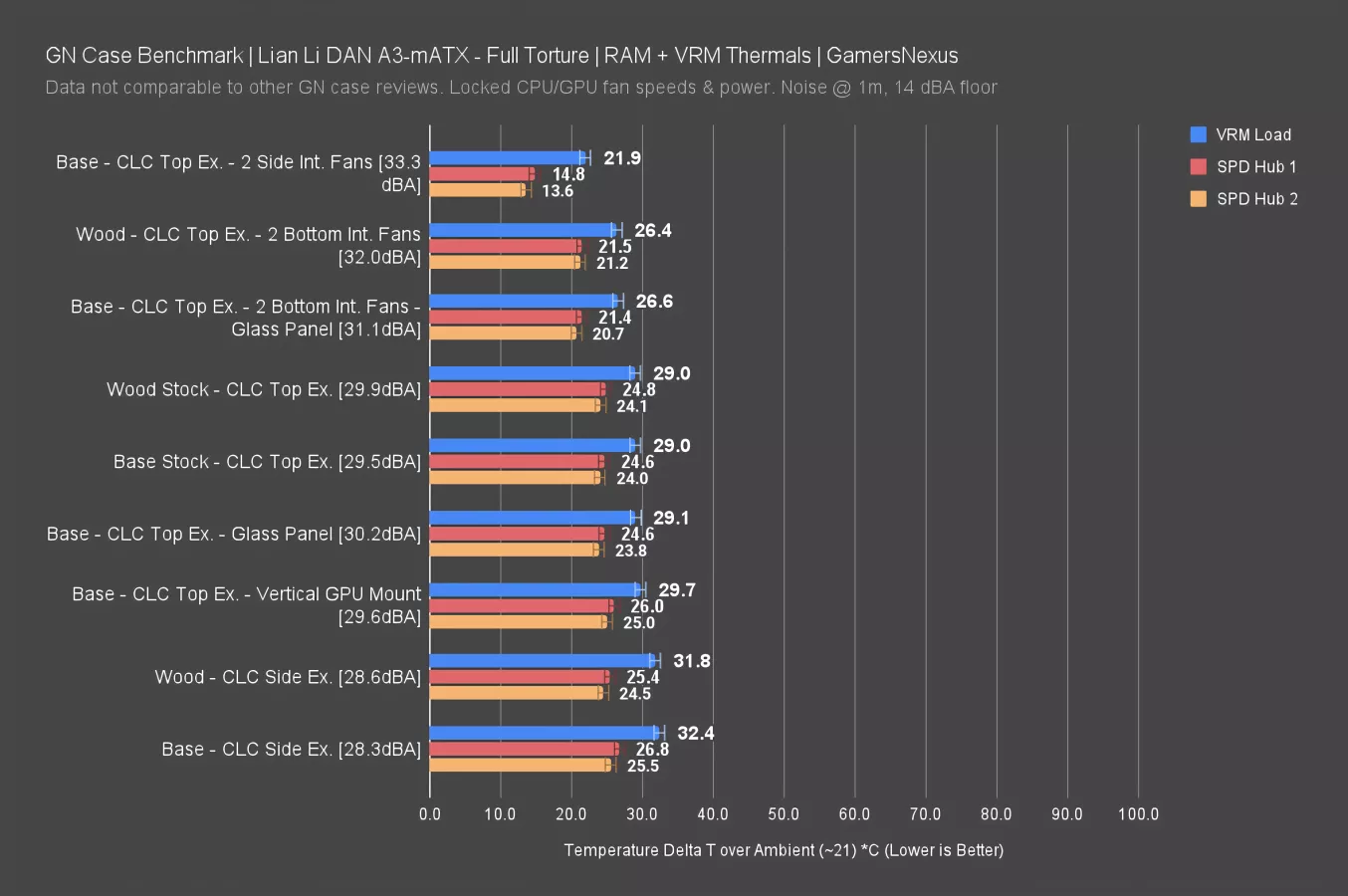 Removing the two case fans puts the case in “wood stock” configuration, which is 1.5C warmer and not bad, all things considered. Other configurations filter in below, with the base vertical GPU mount and CLC side exhaust setups coming in last at about 48C over ambient.