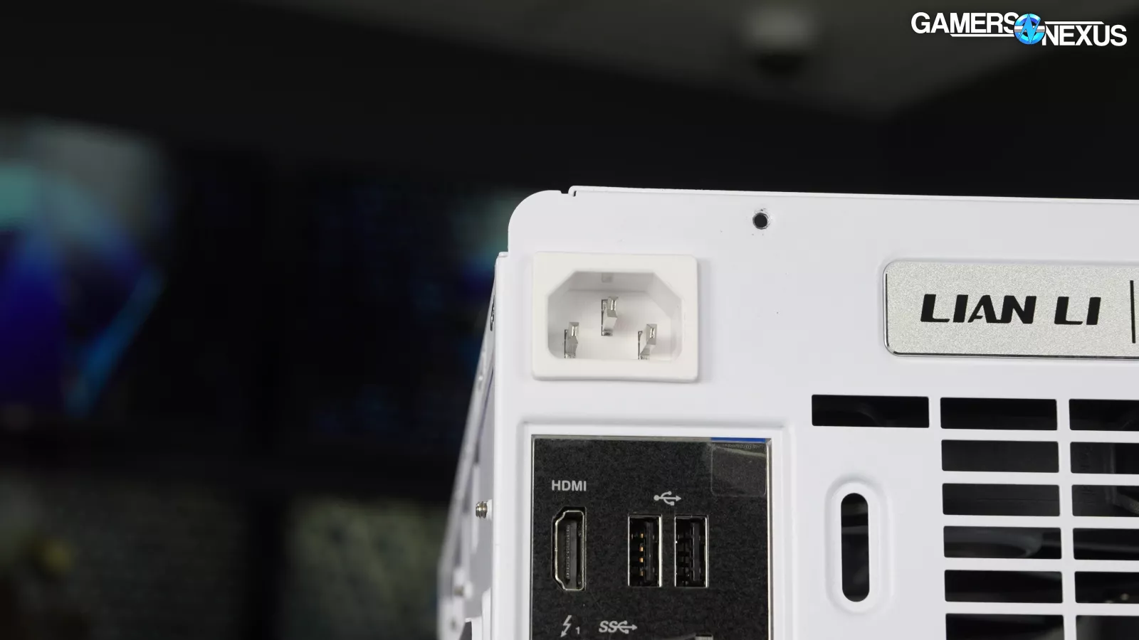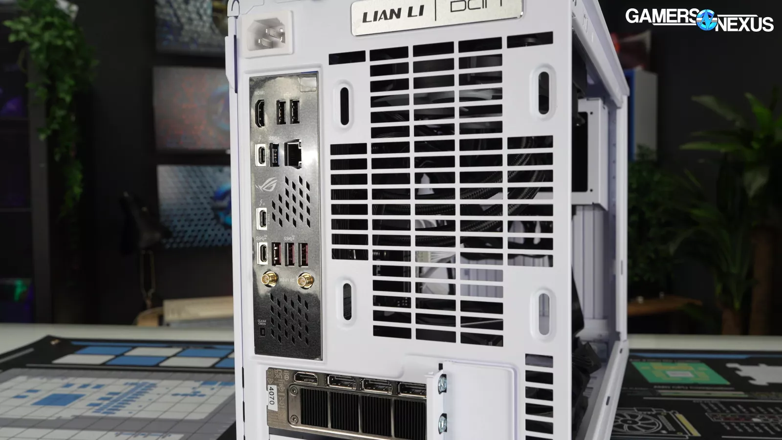 On the bad side, we think not integrating into the rear I/O of the case itself is a sub-optimal solution that makes plugging or unplugging display cables an annoying operation, even with how infrequent that is in normal use. It requires removing the left side panel and fishing it through the replacement PCIe bracket grommet. Unfortunately, the pass-through doesn’t line up with the GPU itself, making it that much more awkward. It does work, just not well.