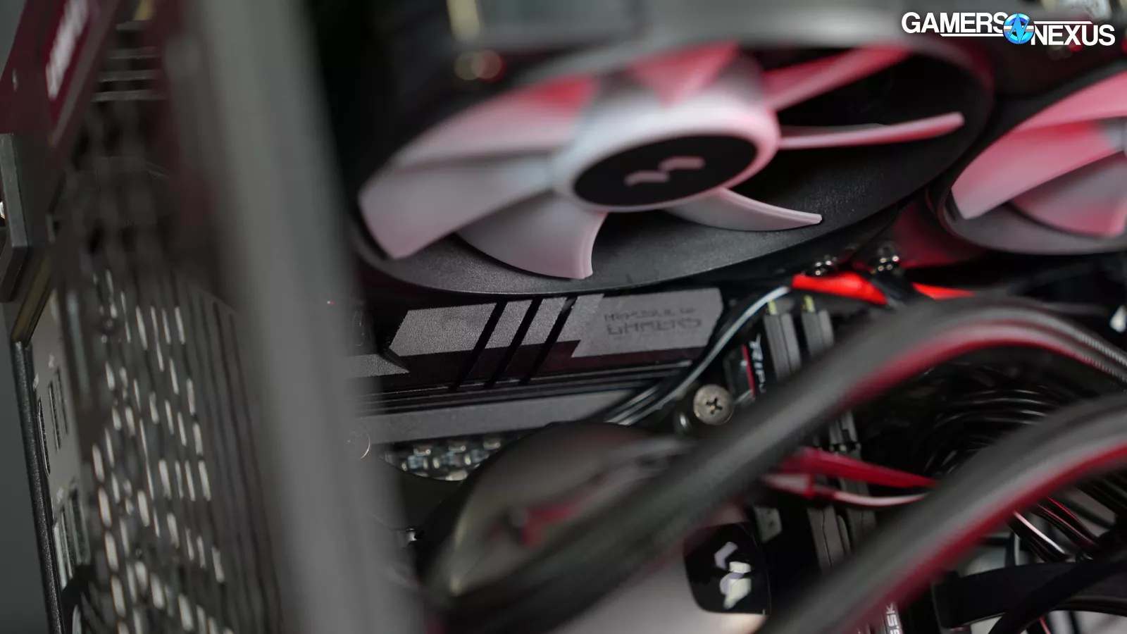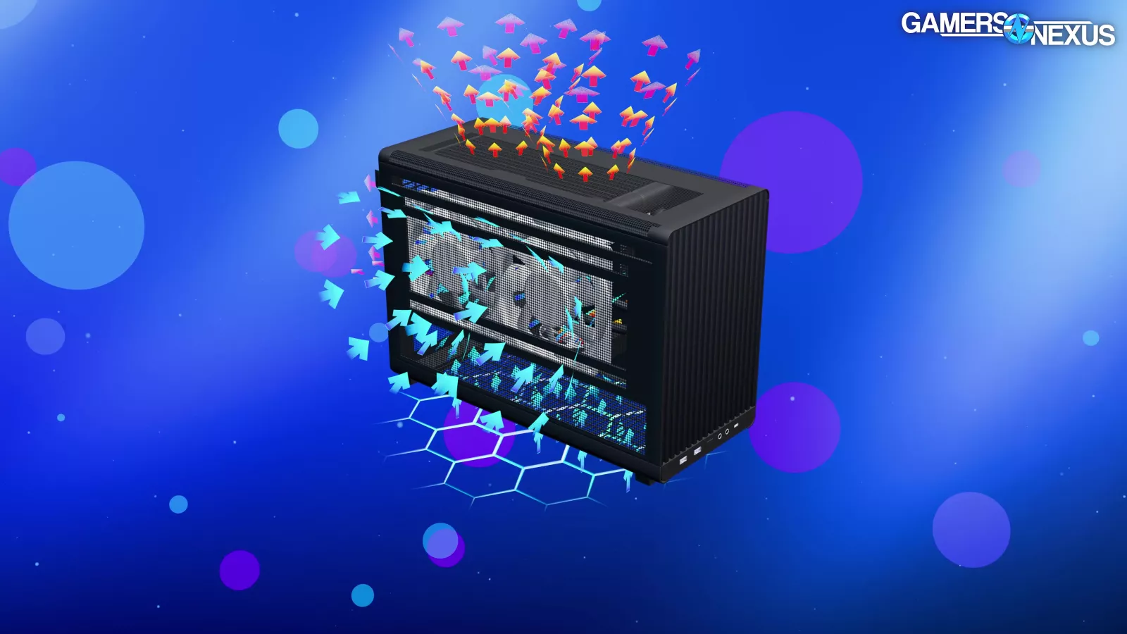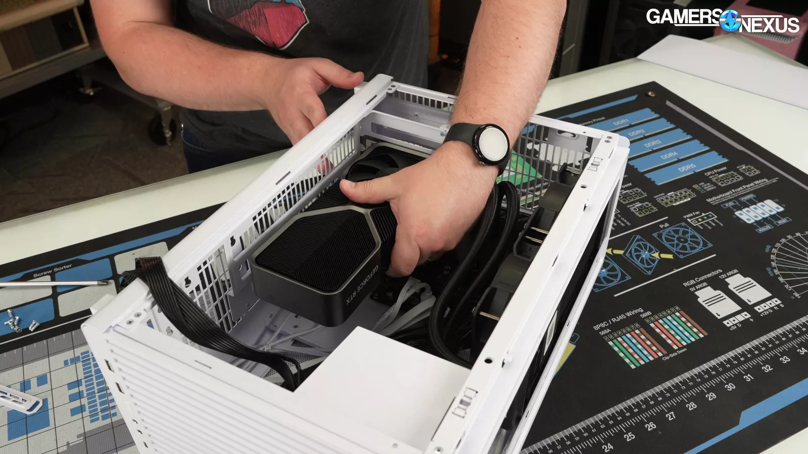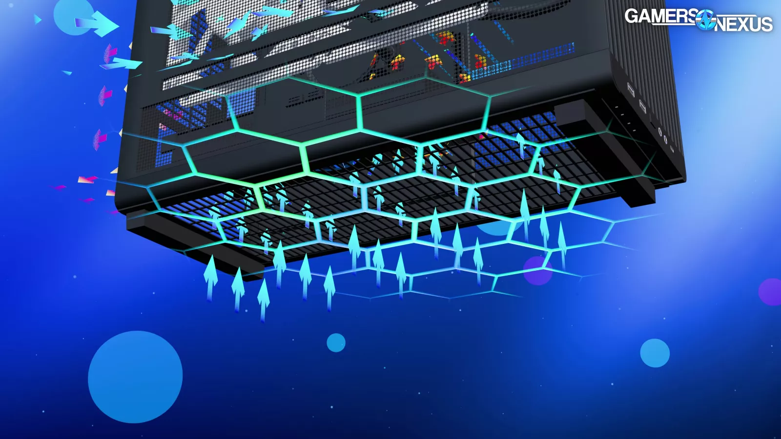 The impact to GPU thermals is massive. We measured about an 11-degree drop in average GPU temperature by getting rid of the side intake, extra fans. To help make this easier to understand, we made a custom 3D animation and we’ll come back to thermals later.