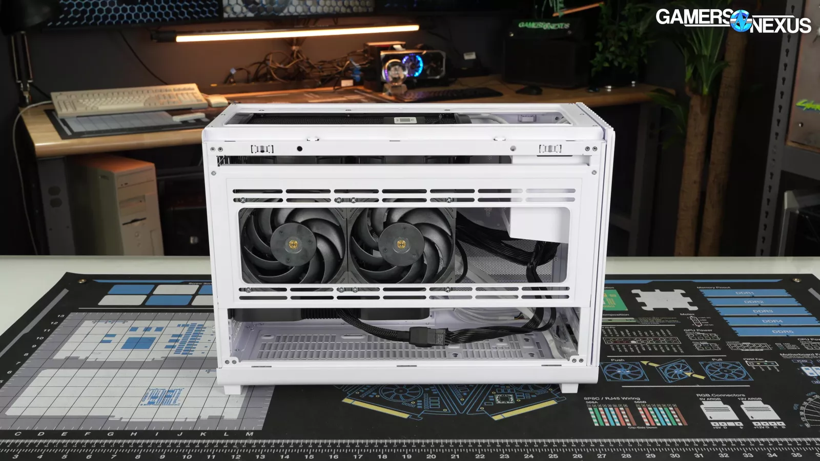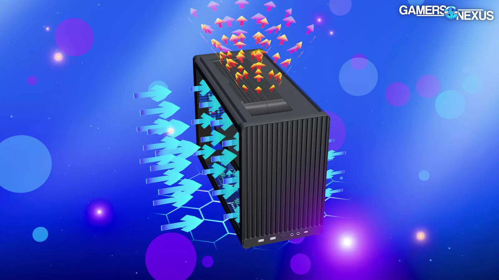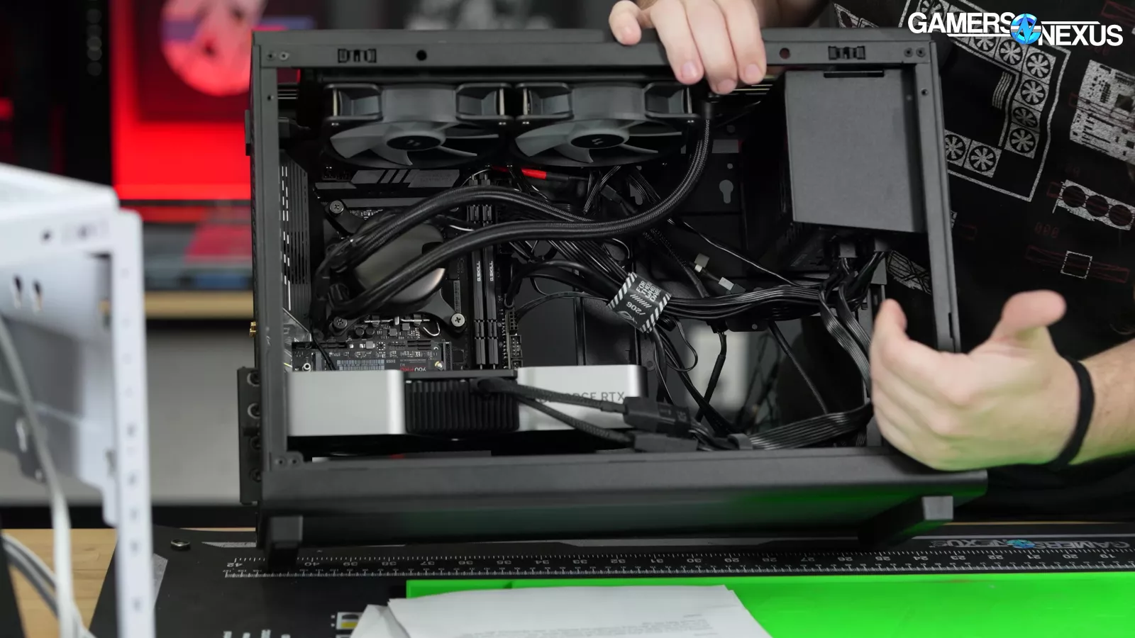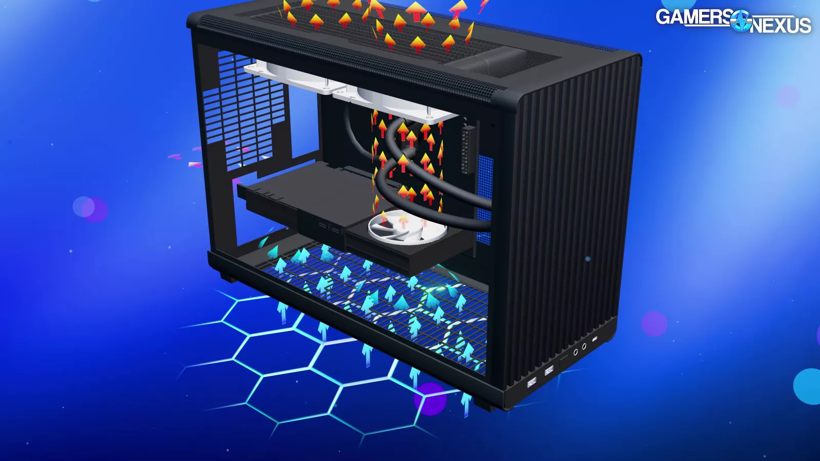 Our animation explains what we think is happening. When the system is configured with only the top exhaust fans, the system is in a negative pressure setup. In PC building terminology, this means there is more forced outflow through fans than intake, from the perspective of the case. As a result, air will naturally find its way in through effectively every hole in the case, but especially the two closest ones: The large, empty fan mount in the back and the empty mesh on the left side panel. This air flows straight in and out the liquid cooler through its fans.