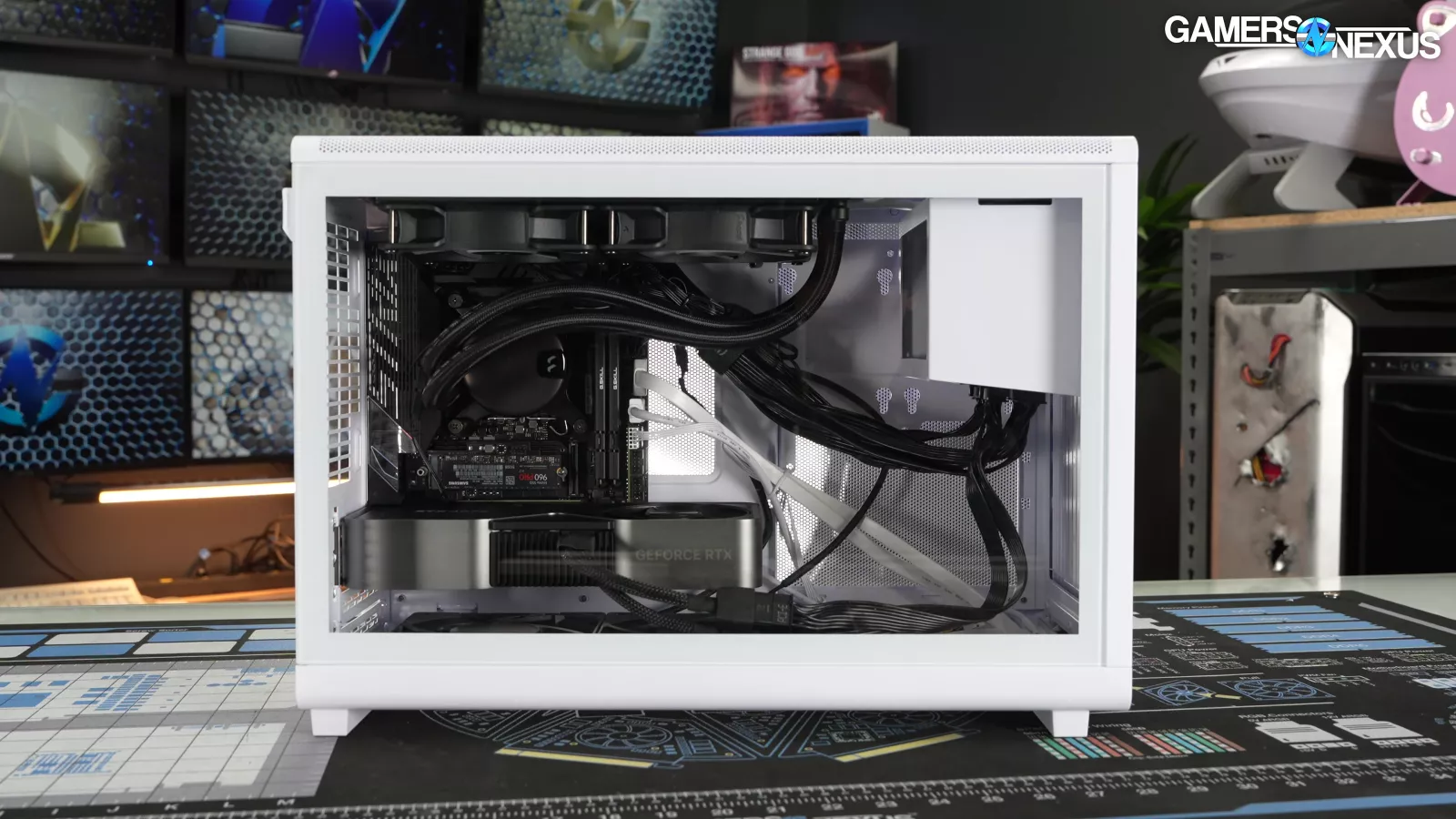 NVIDIA 40 Series Founders Edition cards have no problem fitting inside. The ASUS Strix 4090 fits, but would require careful consideration to not put pressure on the power connector. The massive Gigabyte Aorus Master just barely doesn’t fit due to how tall the card is around the PCIe bracket. But just because it fits doesn’t mean it’d be a good combination for thermals, and we’d recommend against any cards of that size in this case.